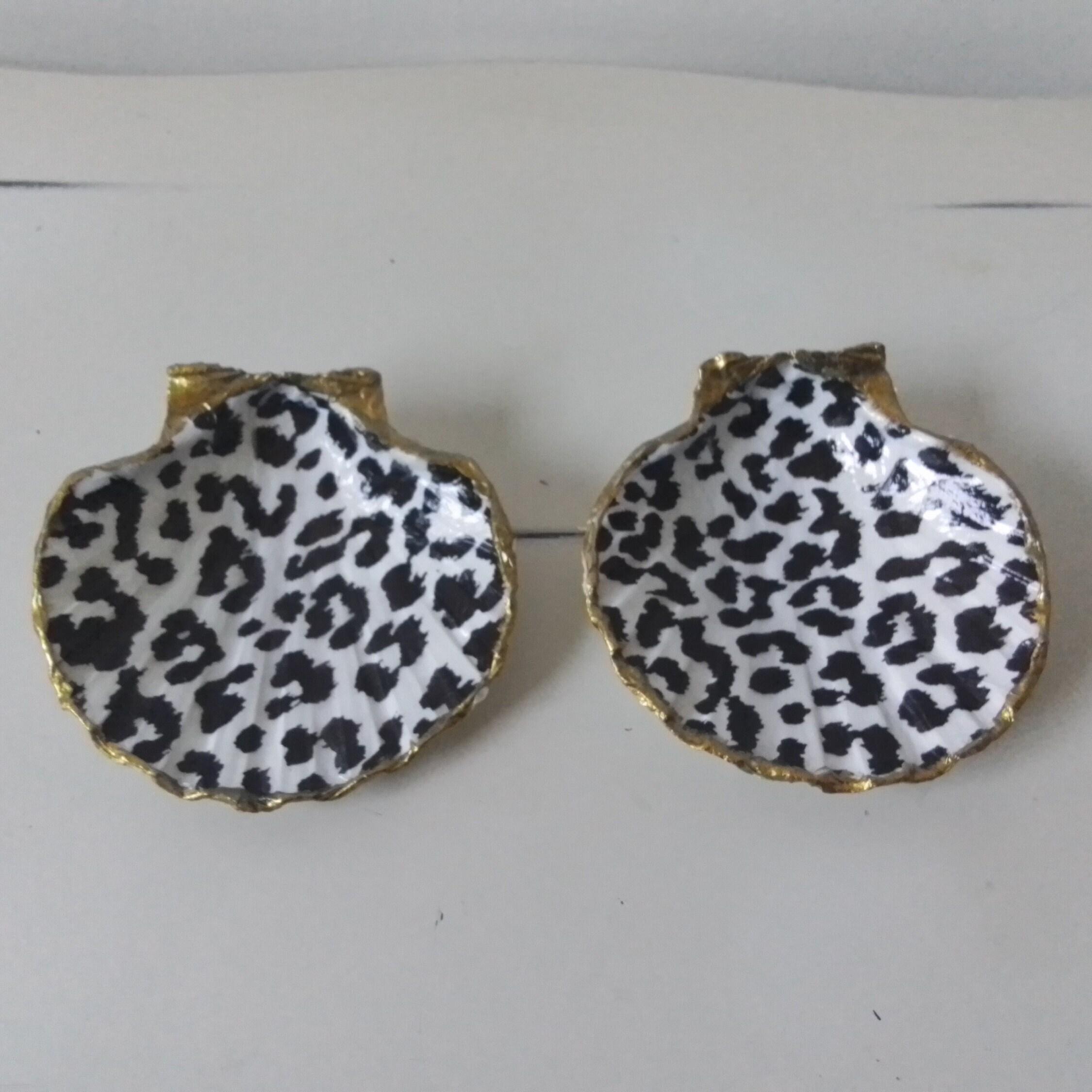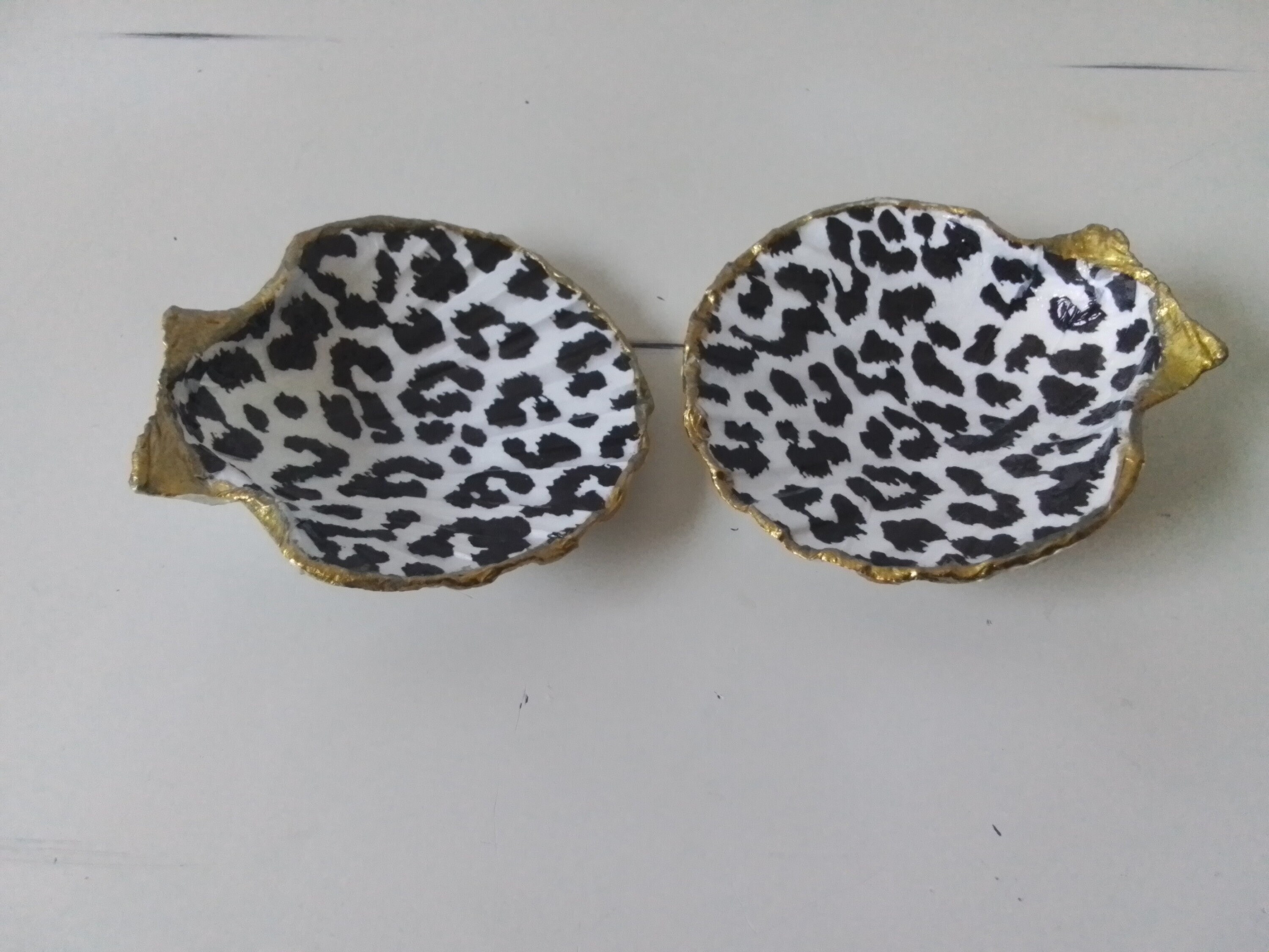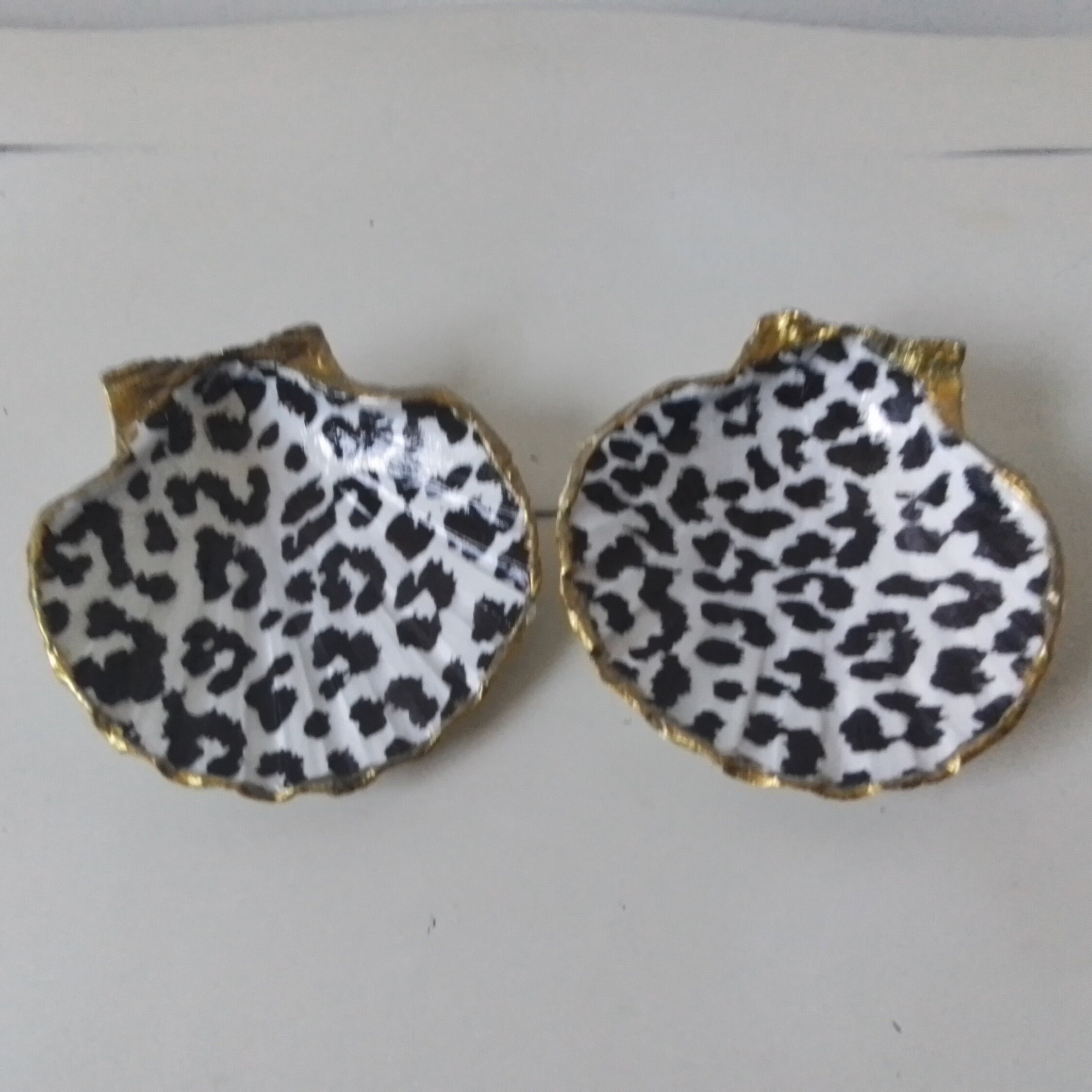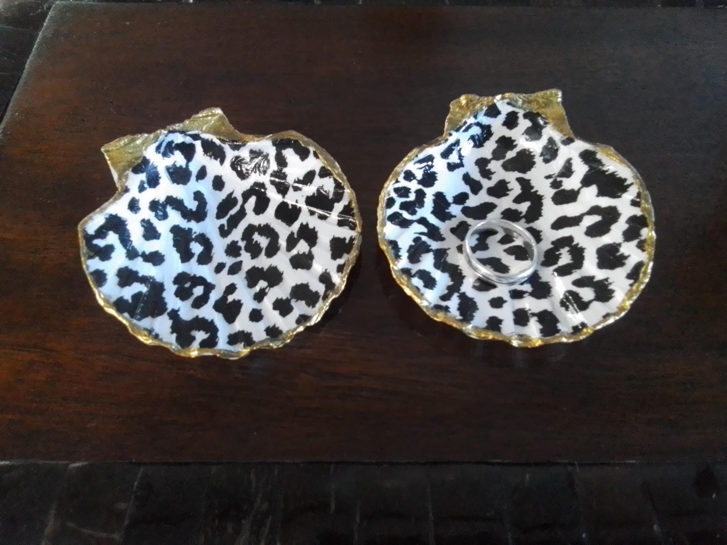 Two Laquered Leopard Print and Bronze Gold Leaf Painted Edge Natural Shell, Ring, Earring, Jewelry Dishes