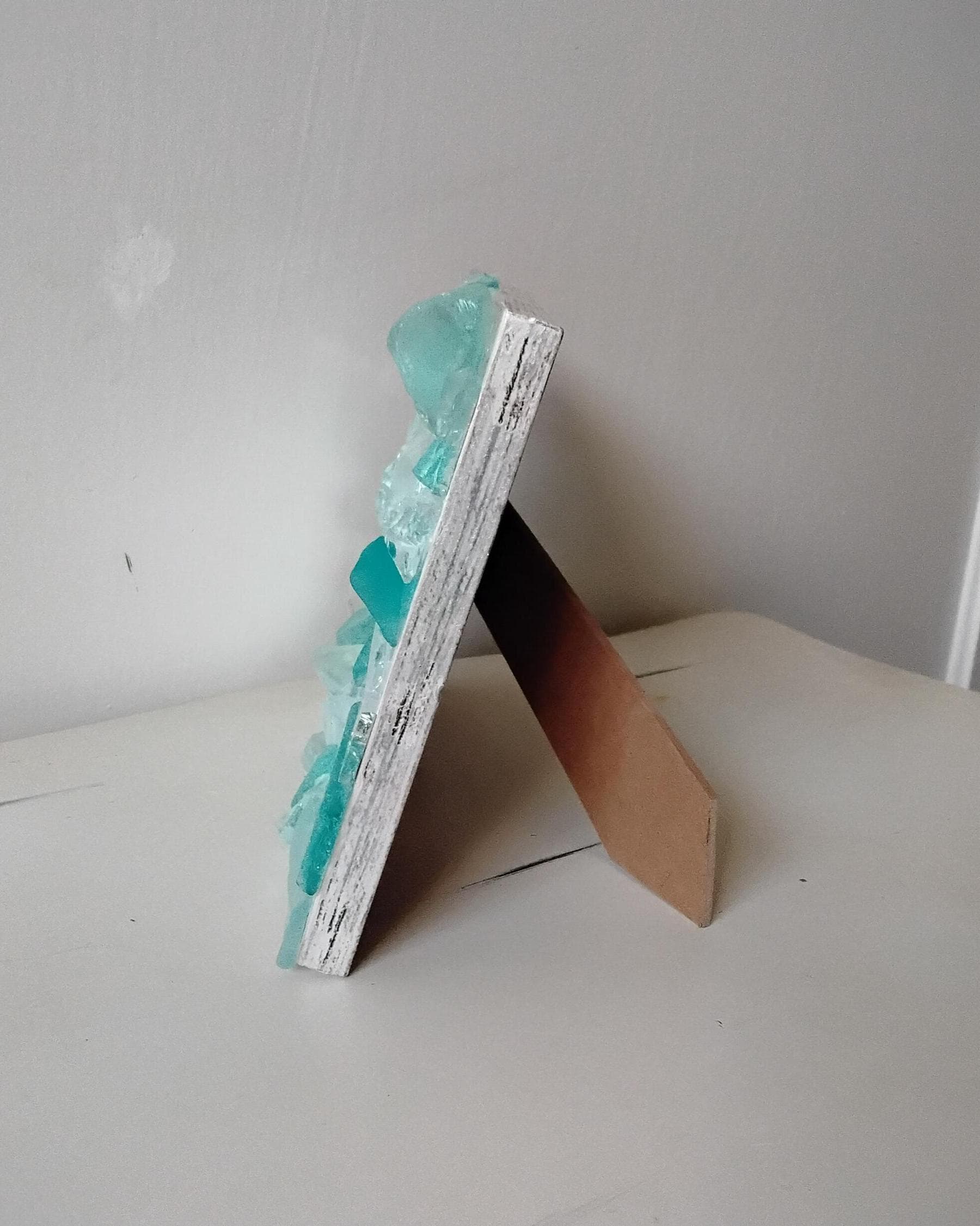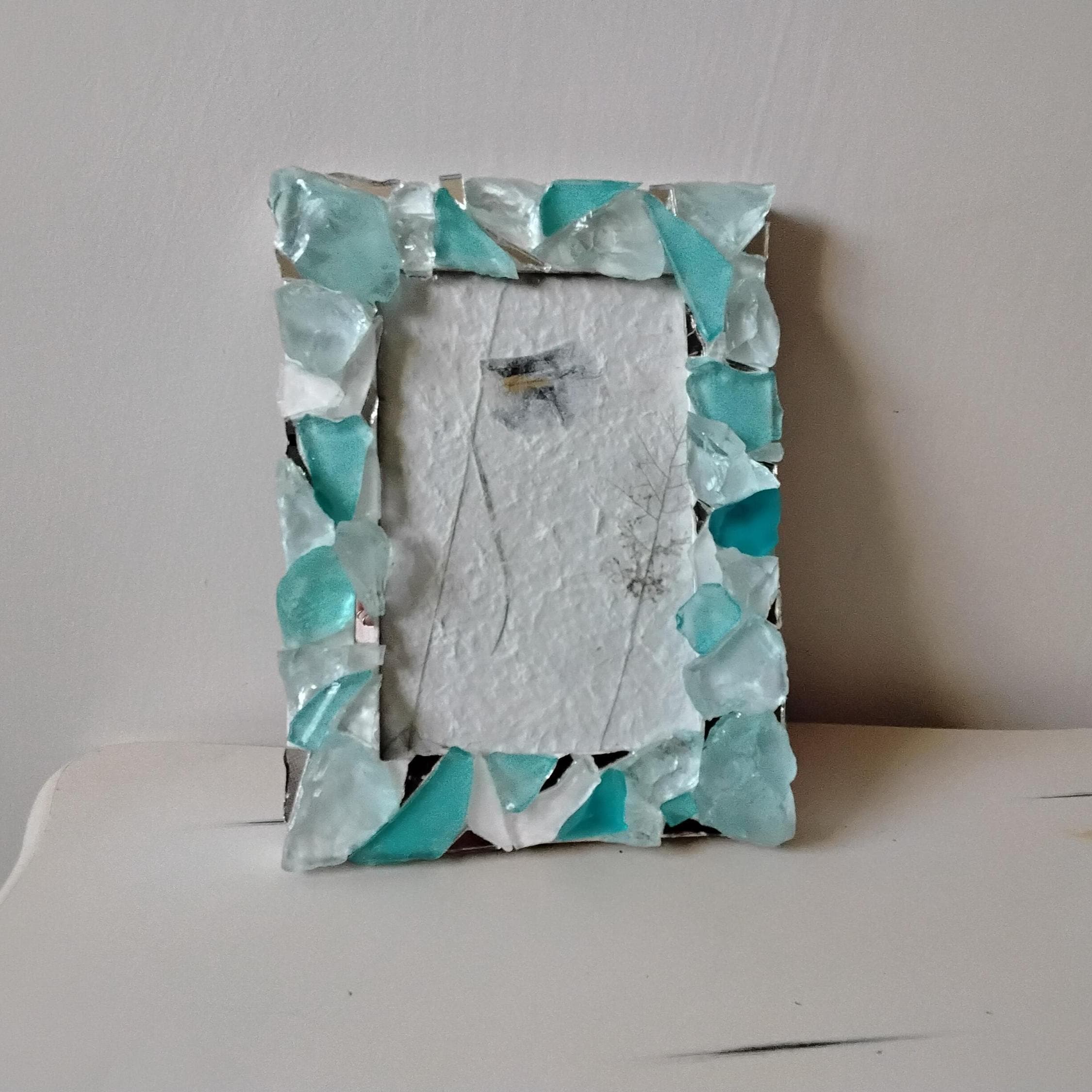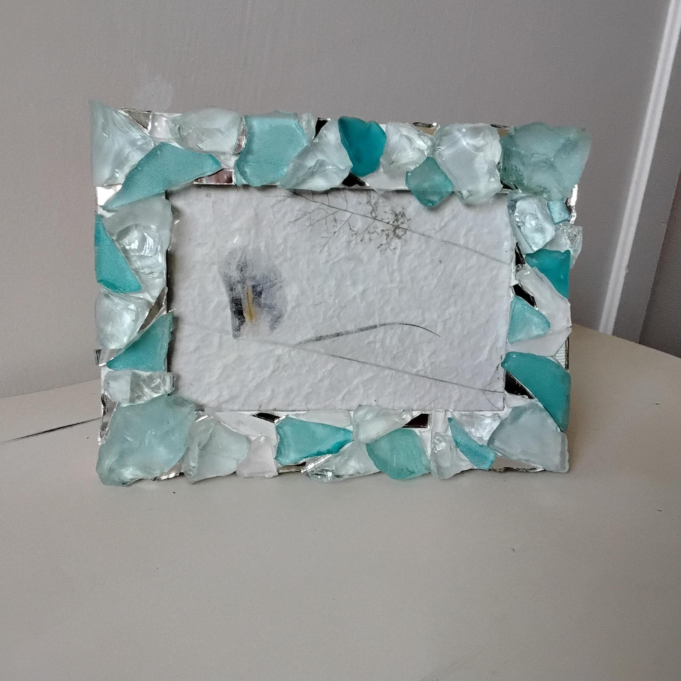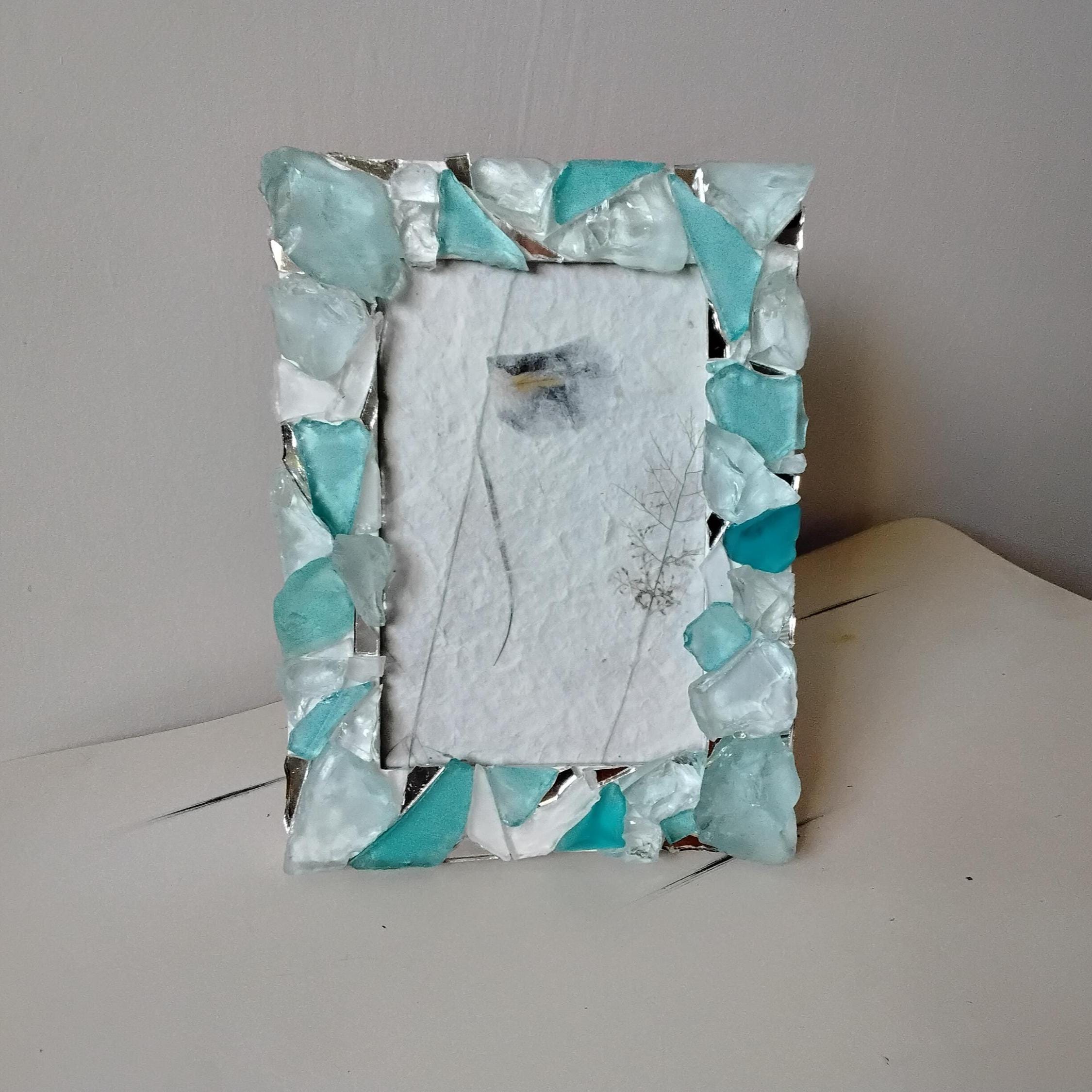 Turquoise Blue Green and White Sea Glass and Mirror, Vertical or Horizontal, Hanging or Tabletop 4 x 6 Inch Wooden Frame with Glass