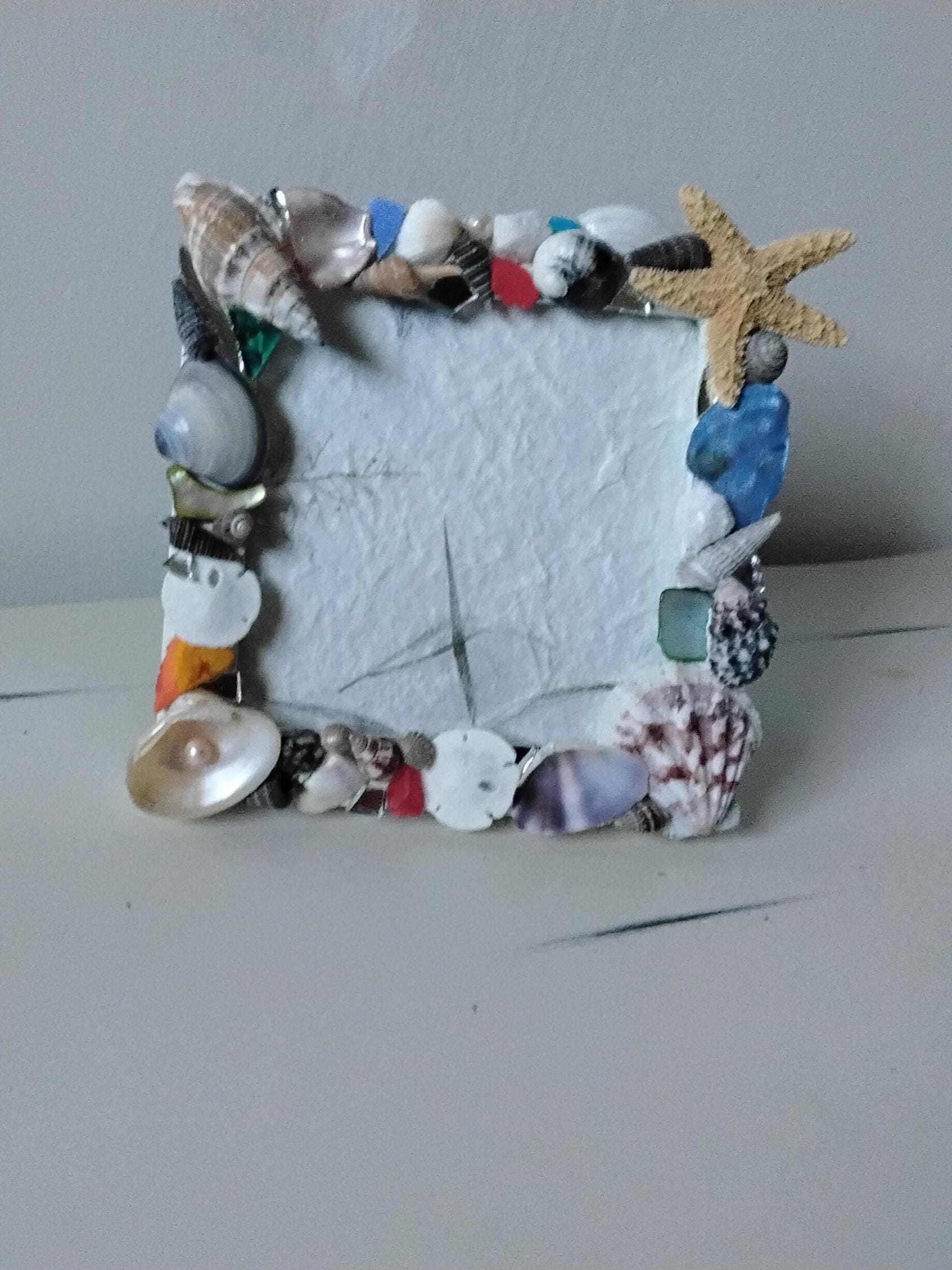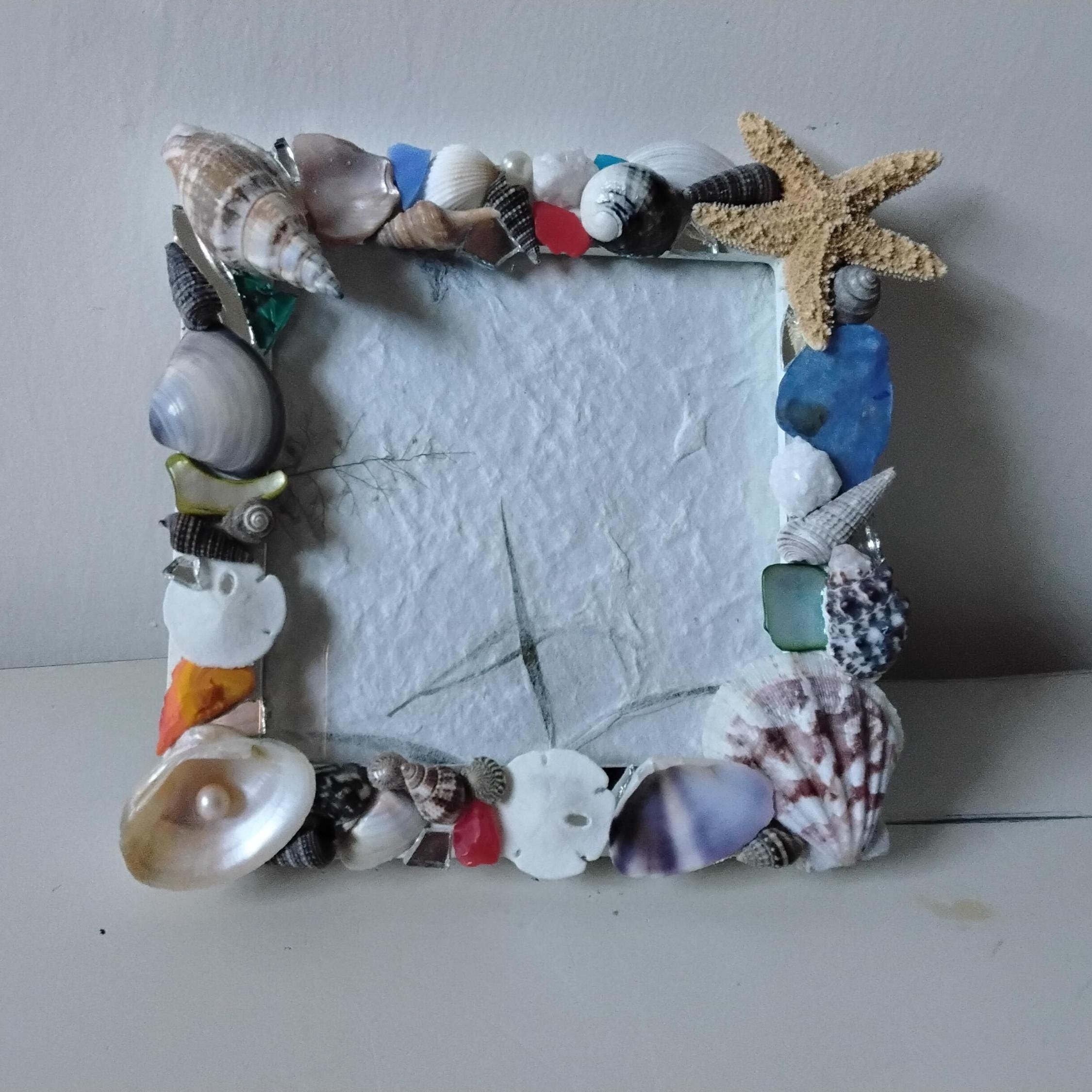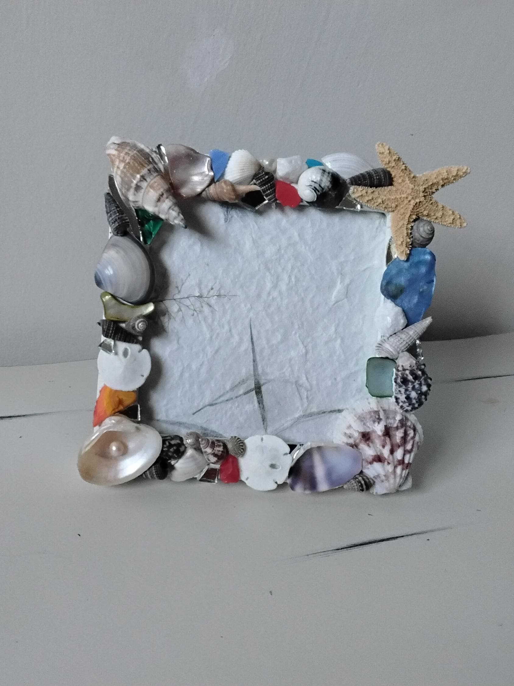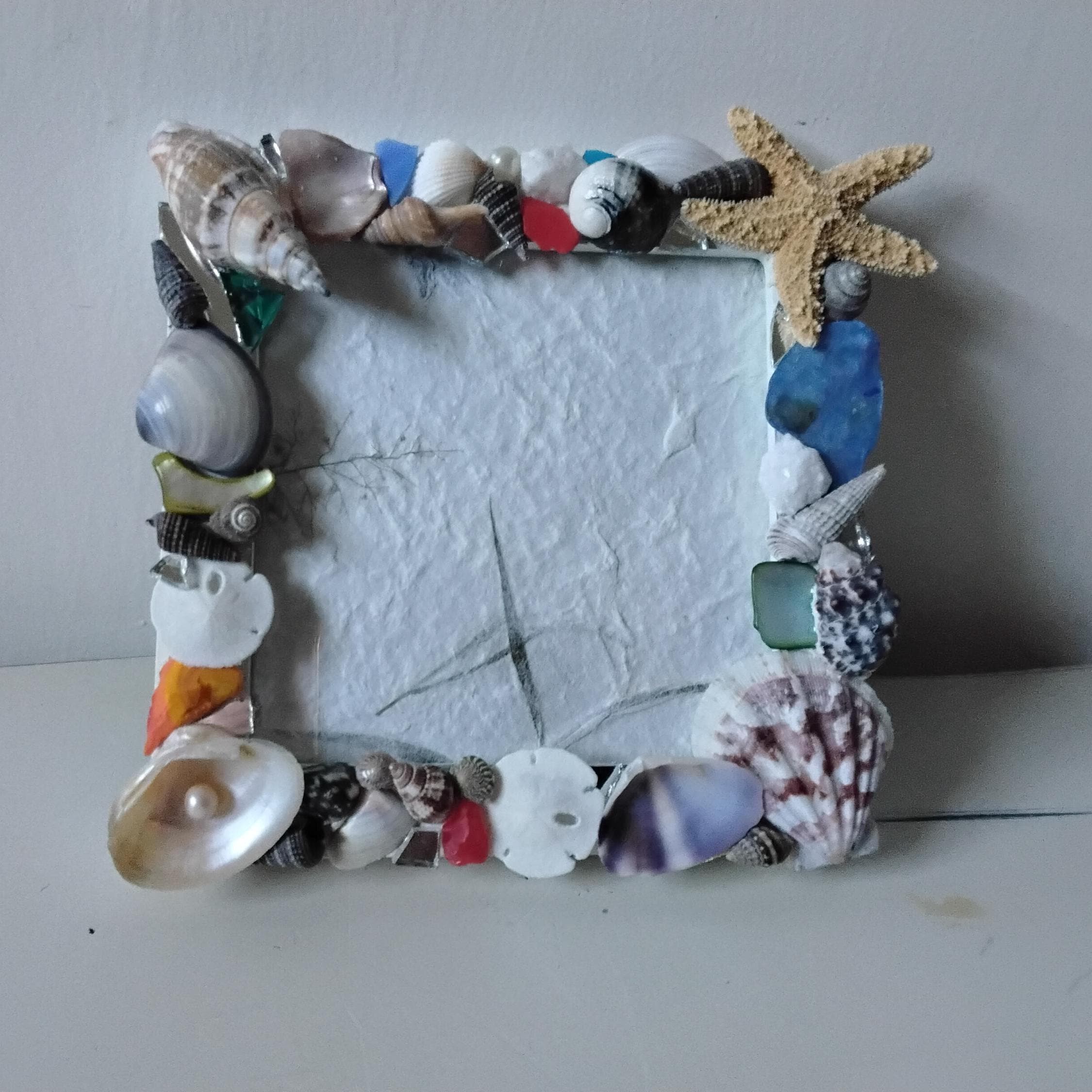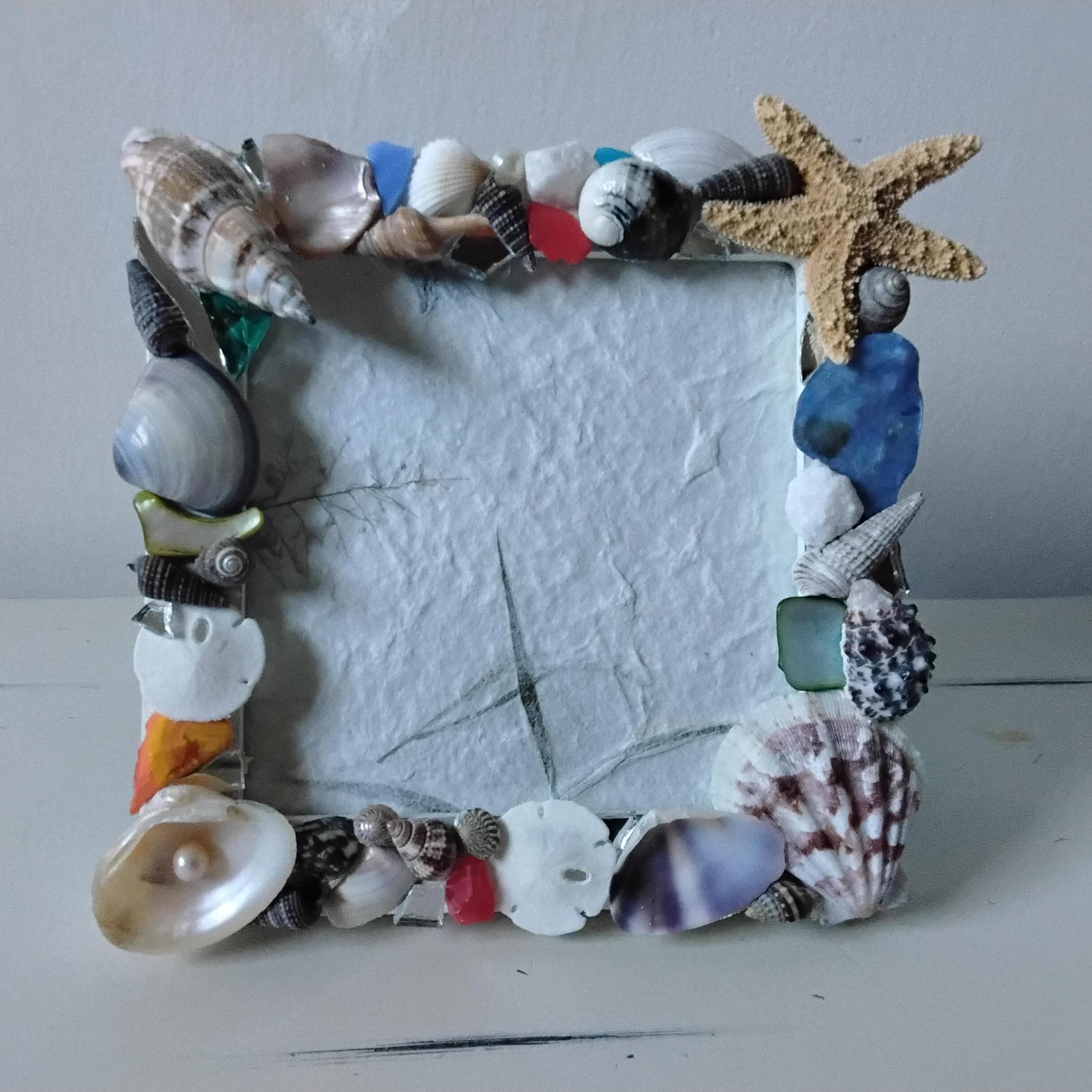 Mosaic Shell, Colored Glass, Sea Glass, and Mirror Encrusted Beachy 4-inch x 4-inch Tabletop or Hanging display Frame with Glass