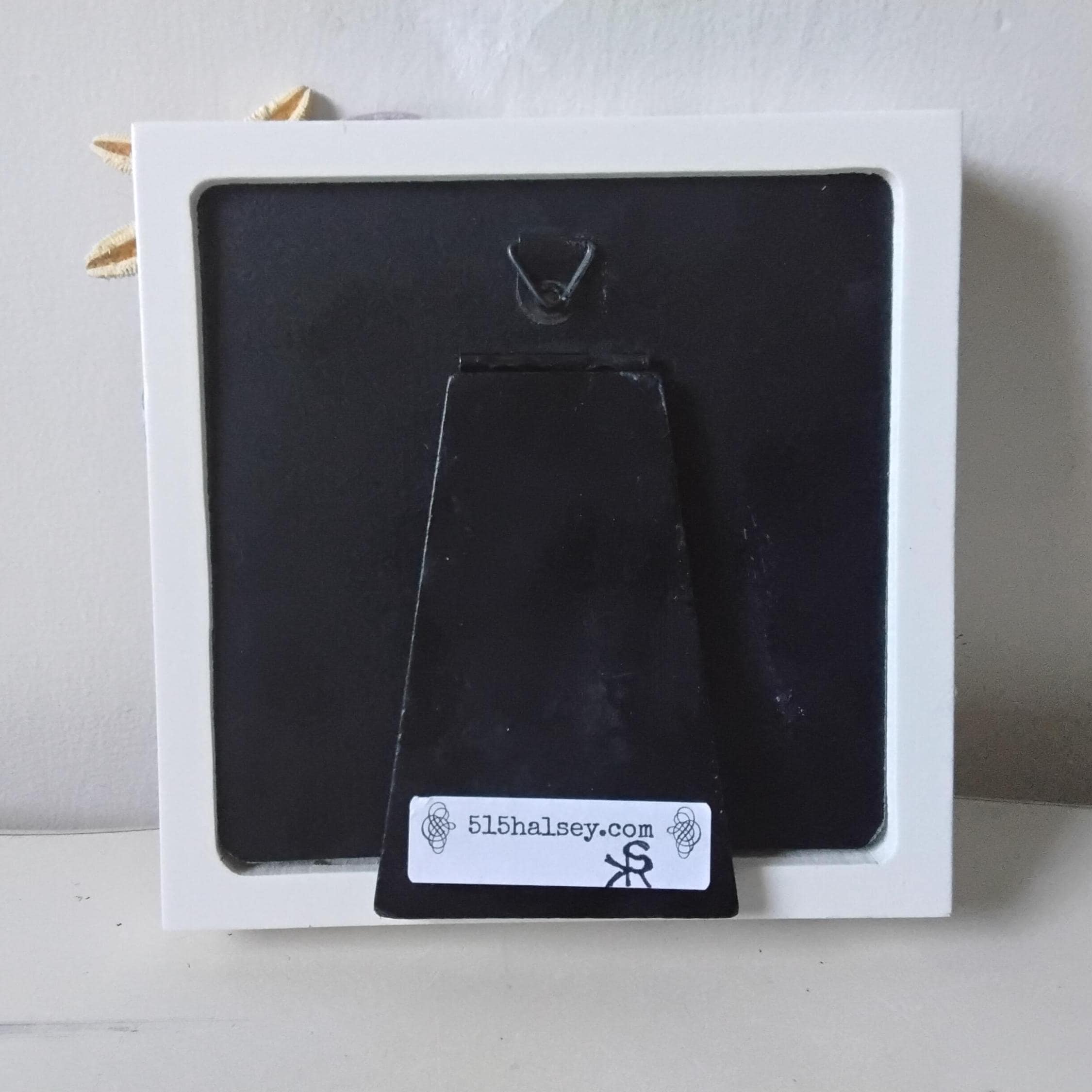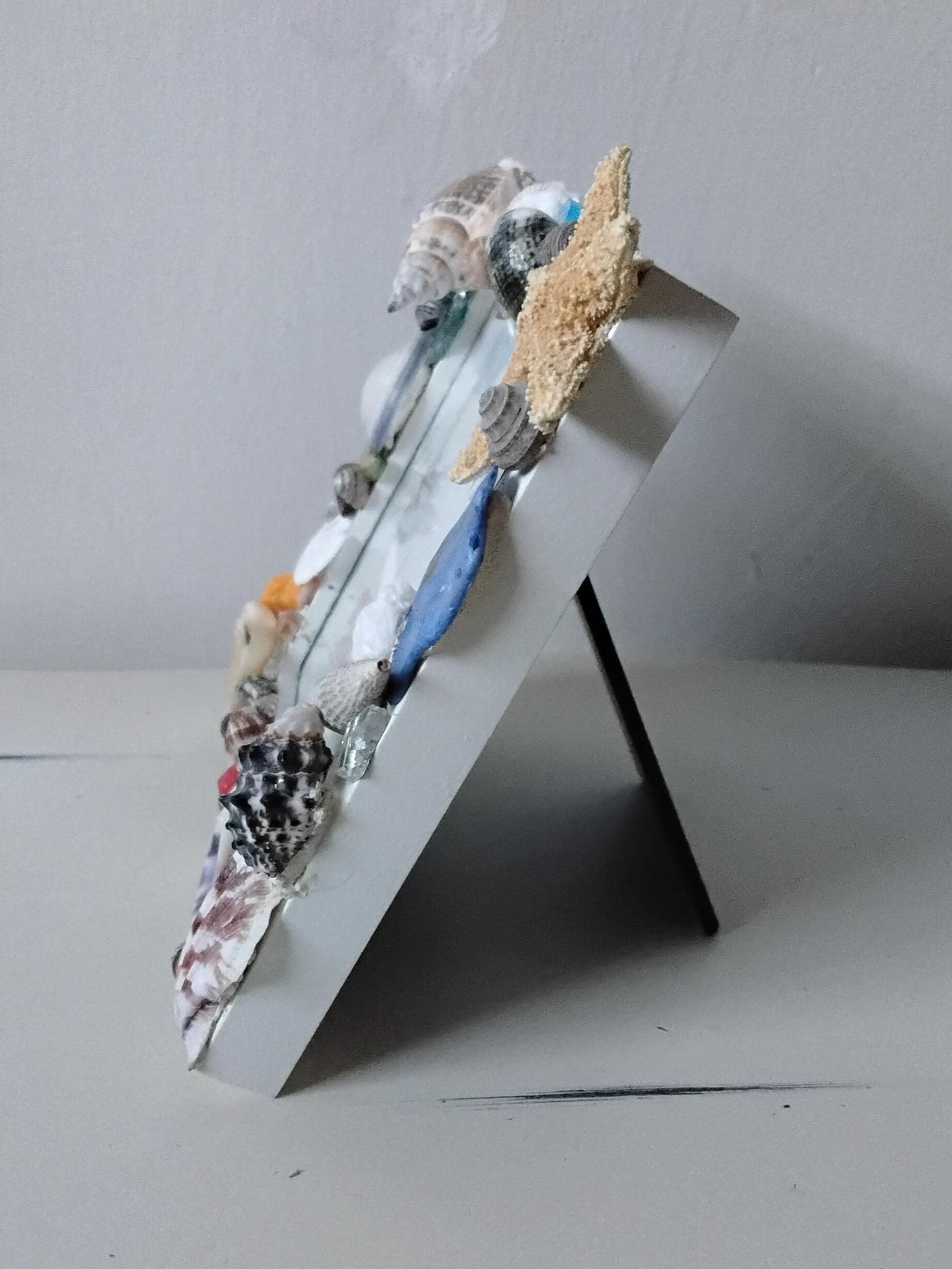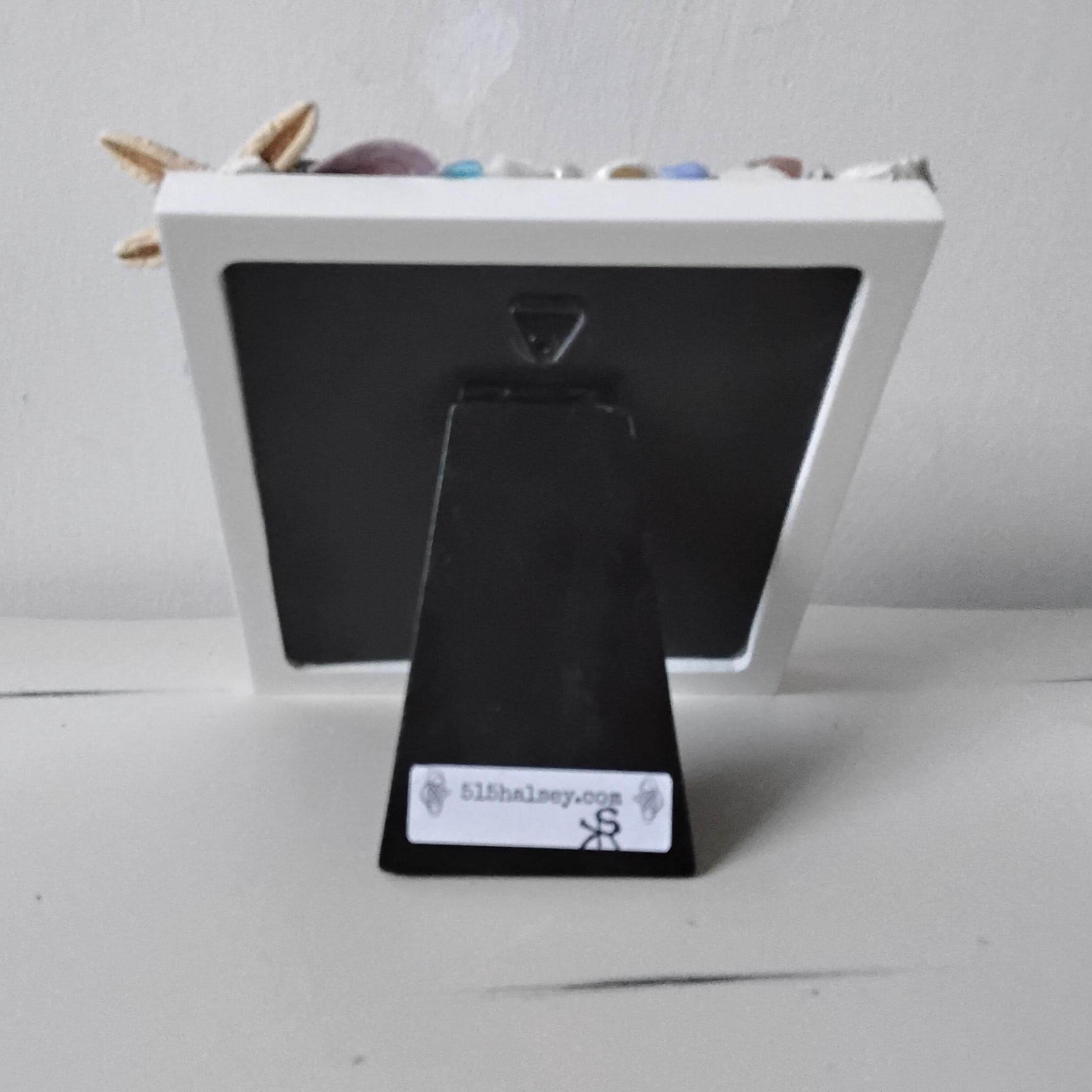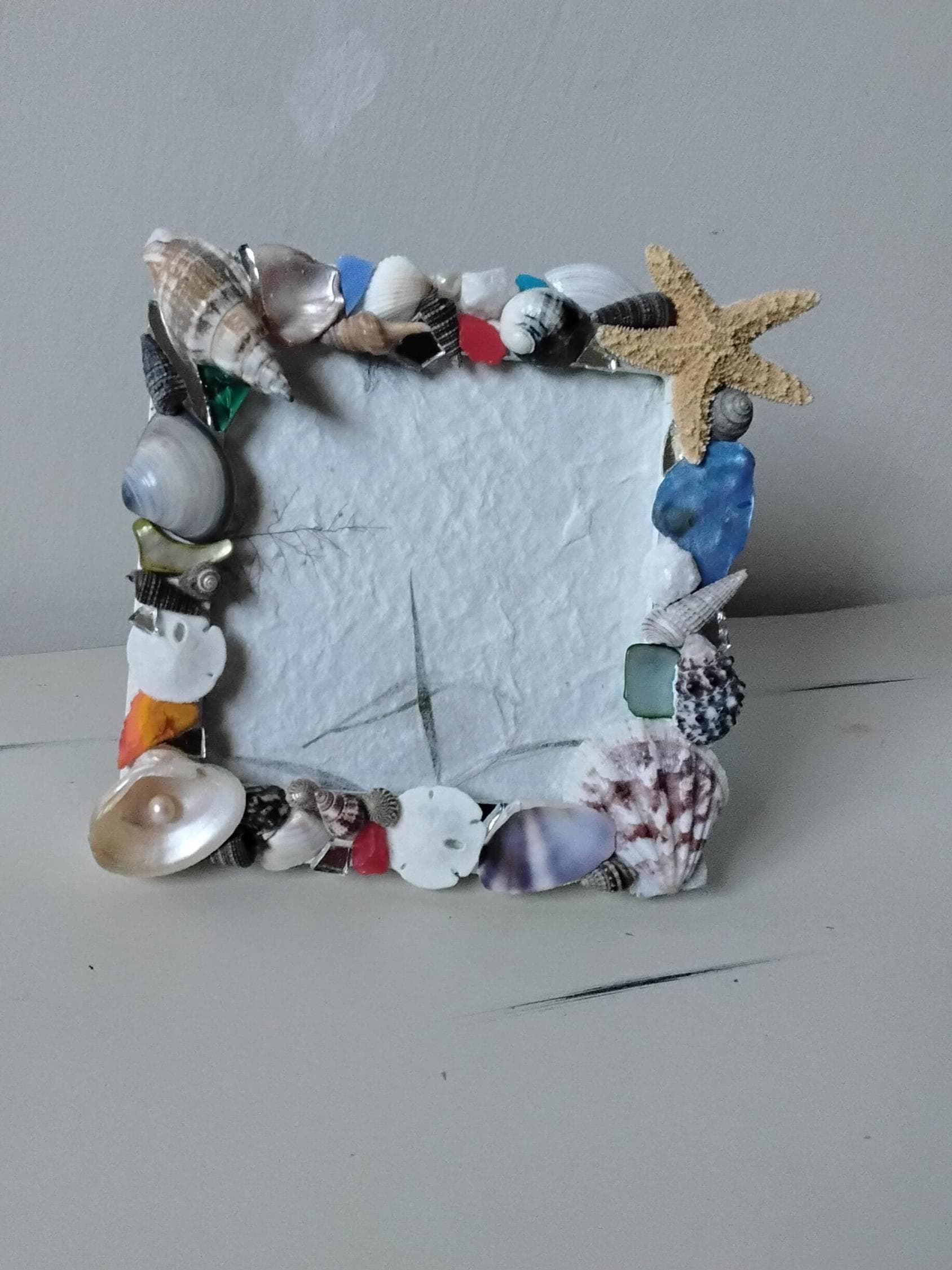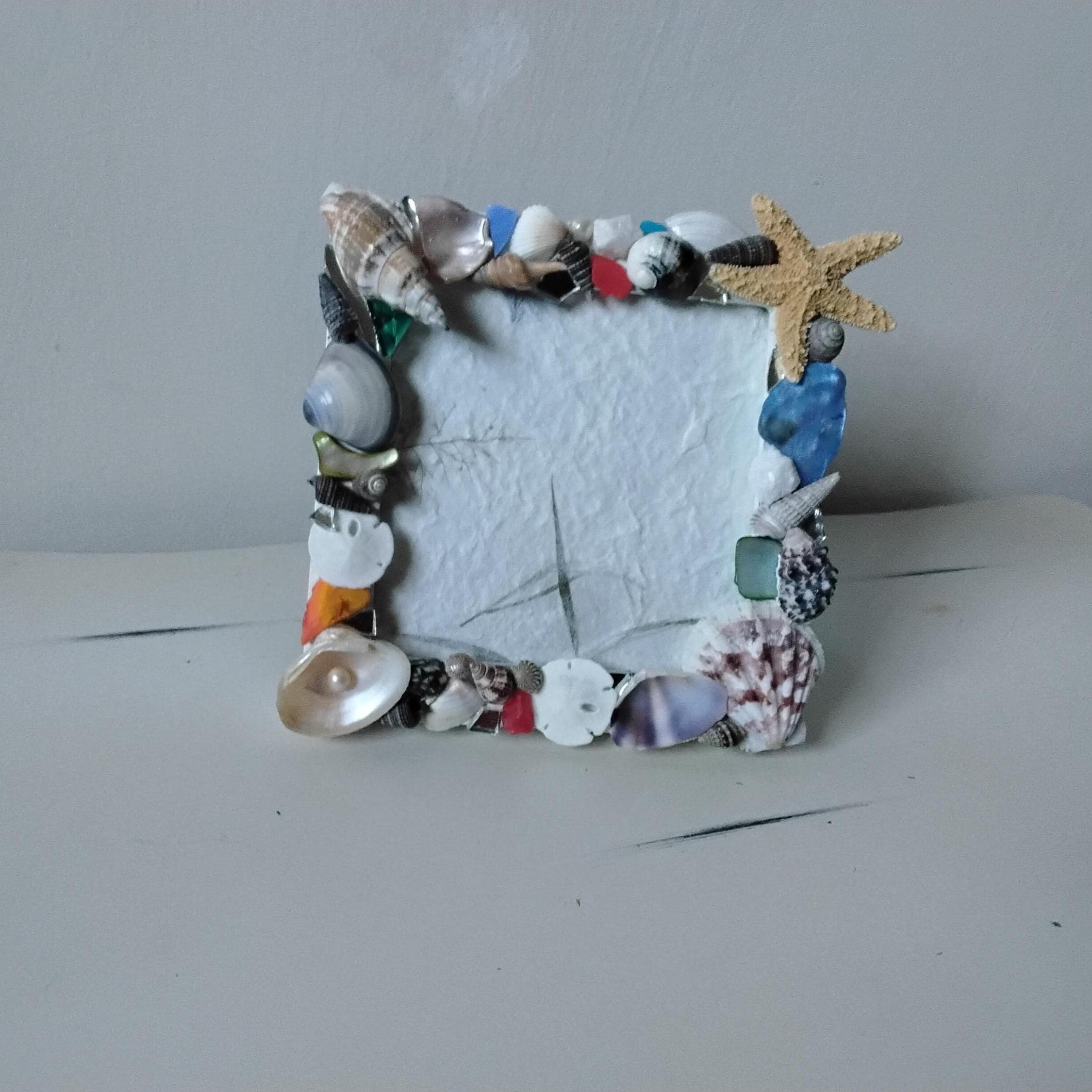 Mosaic Shell, Colored Glass, Sea Glass, and Mirror Encrusted Beachy 4-inch x 4-inch Tabletop or Hanging display Frame with Glass