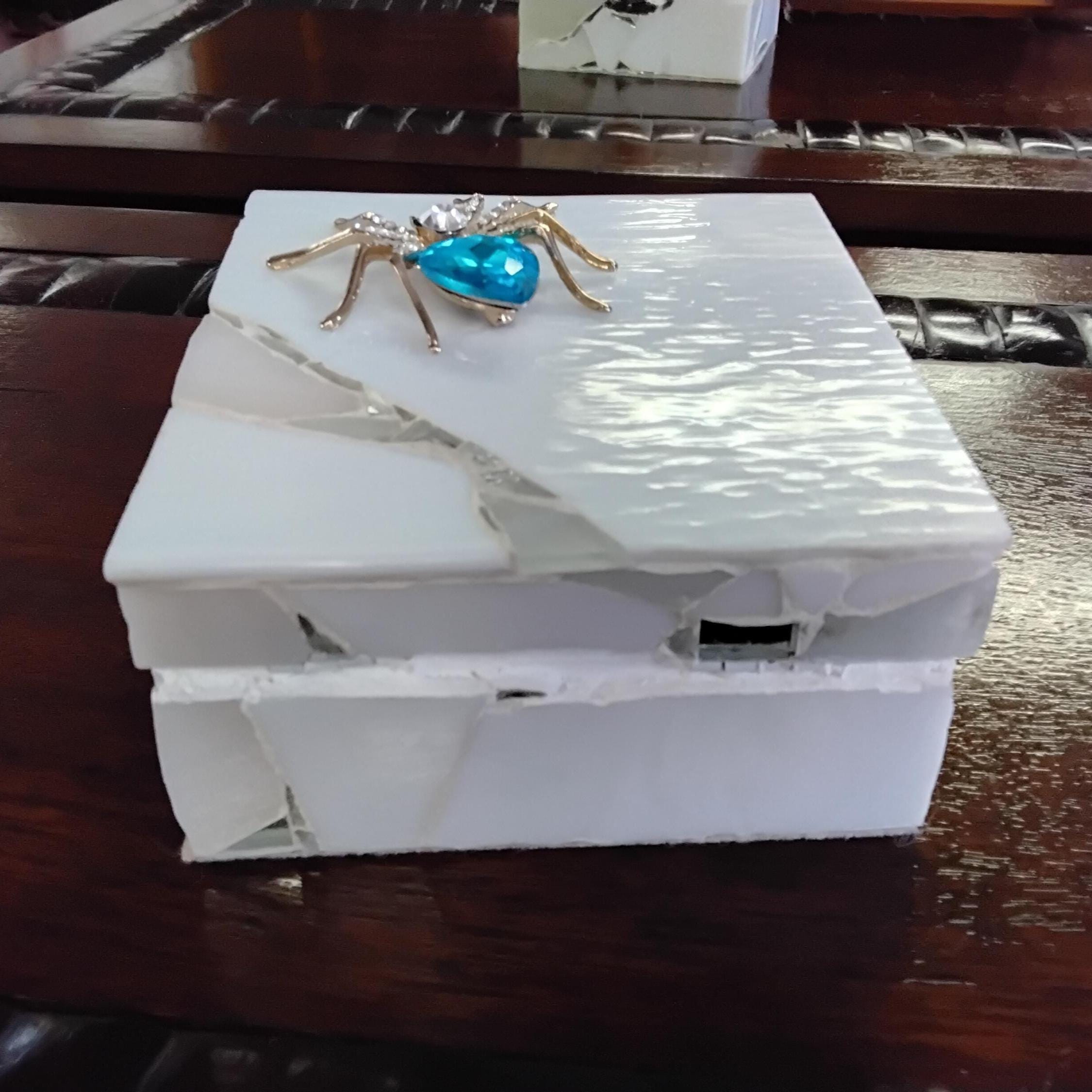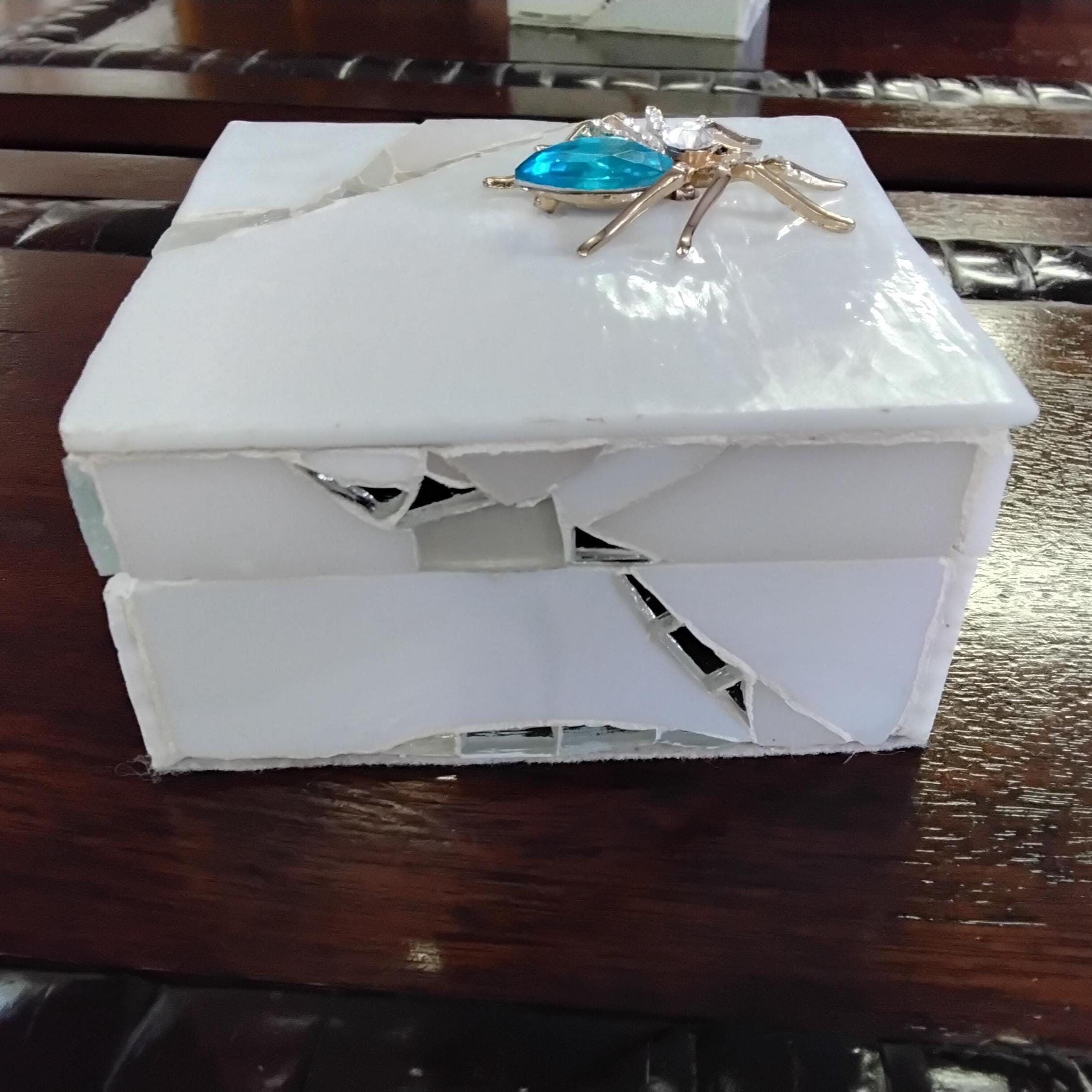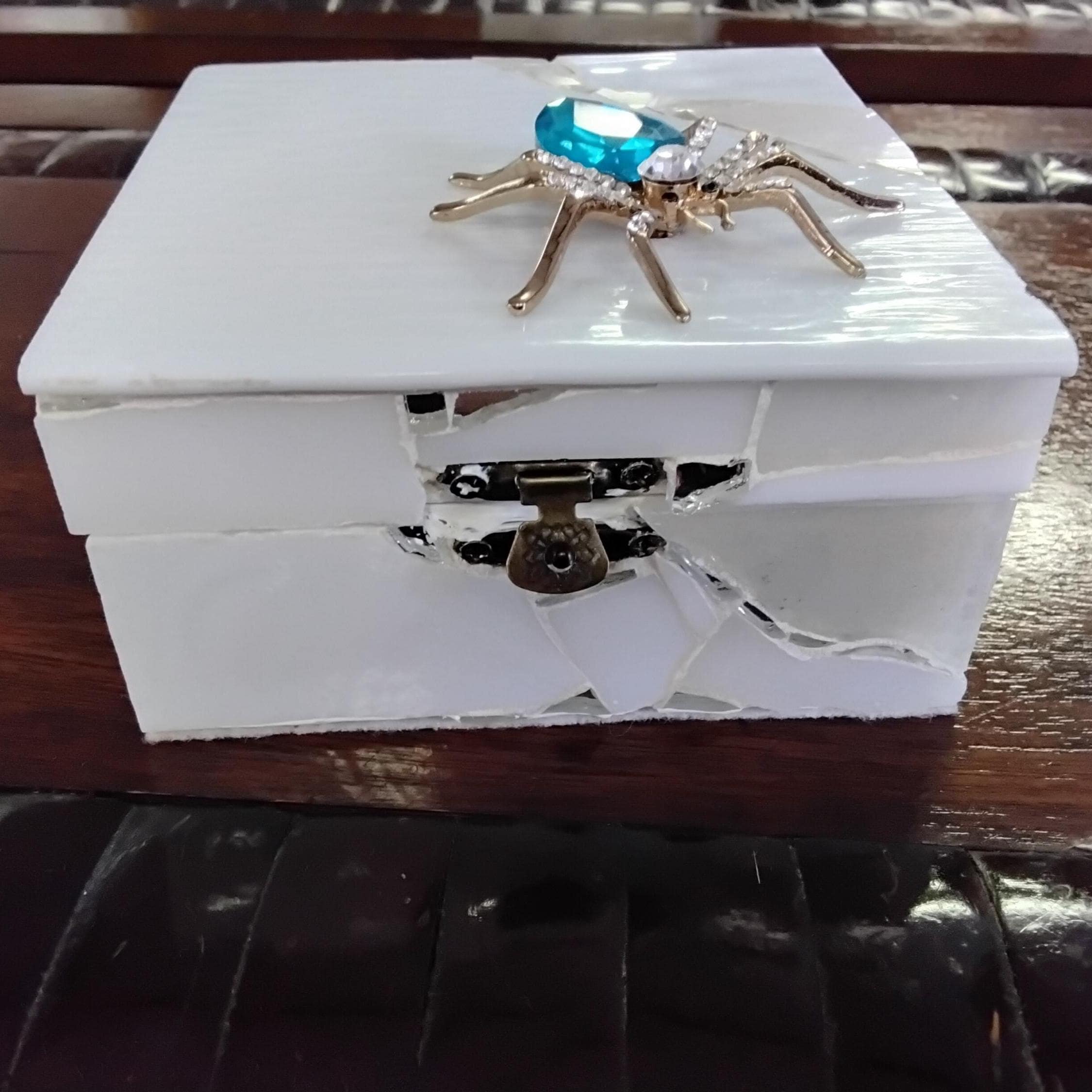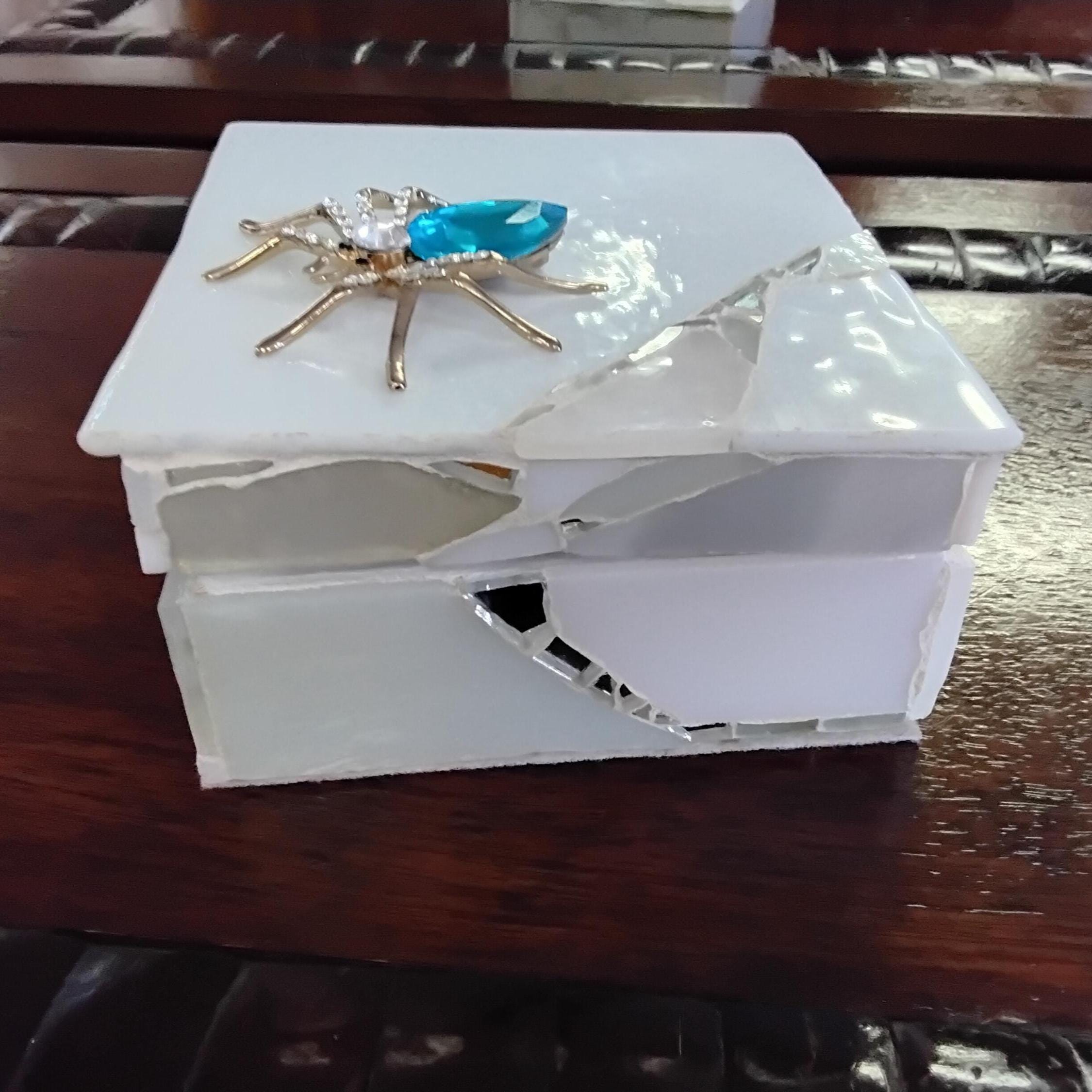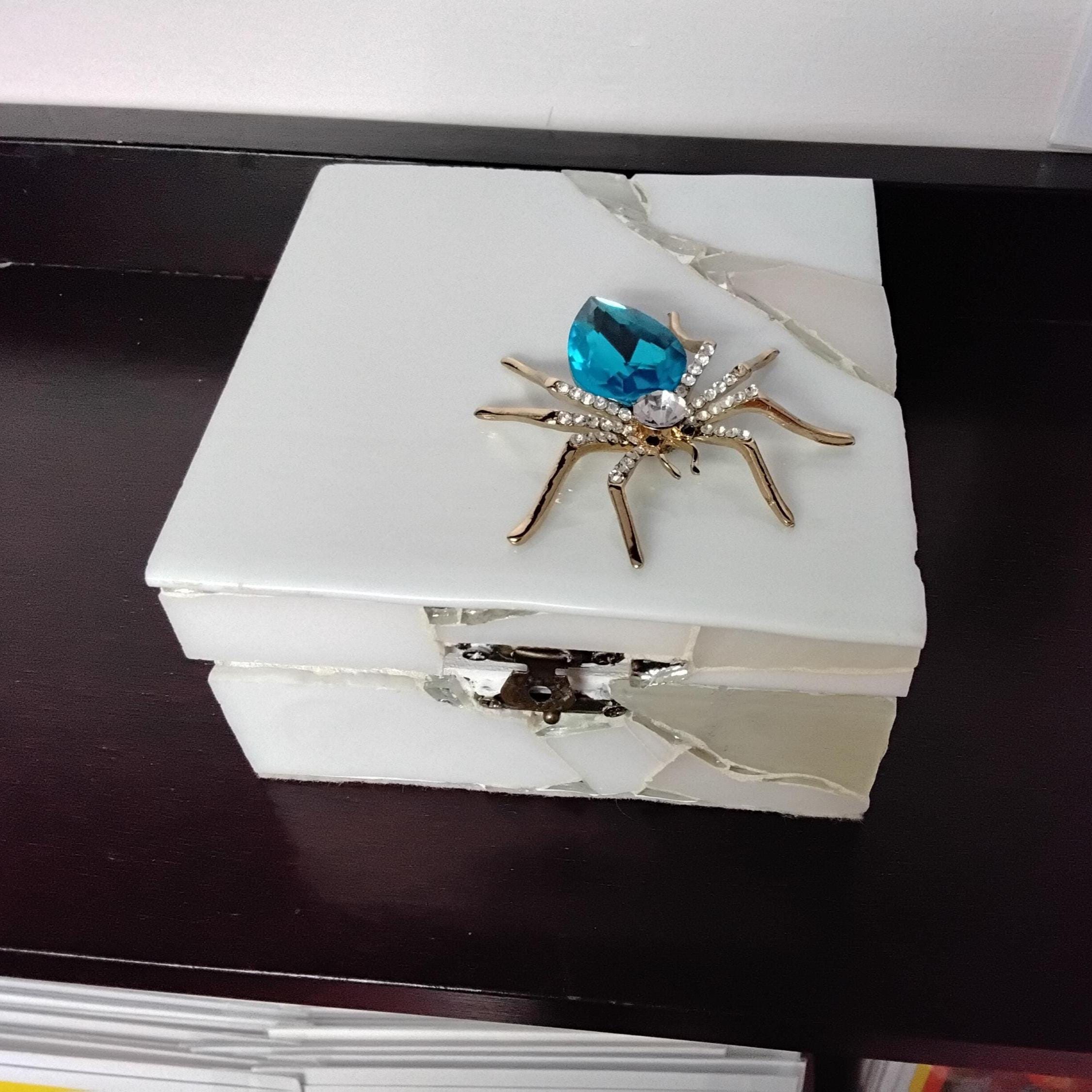 Mosaic Large White Stained Glass and Mirror Jewelry, Trinket, Keepsake Square Hinged Box with a Silver Plated Rhinestone, and Sapphire Glass Spider on Top