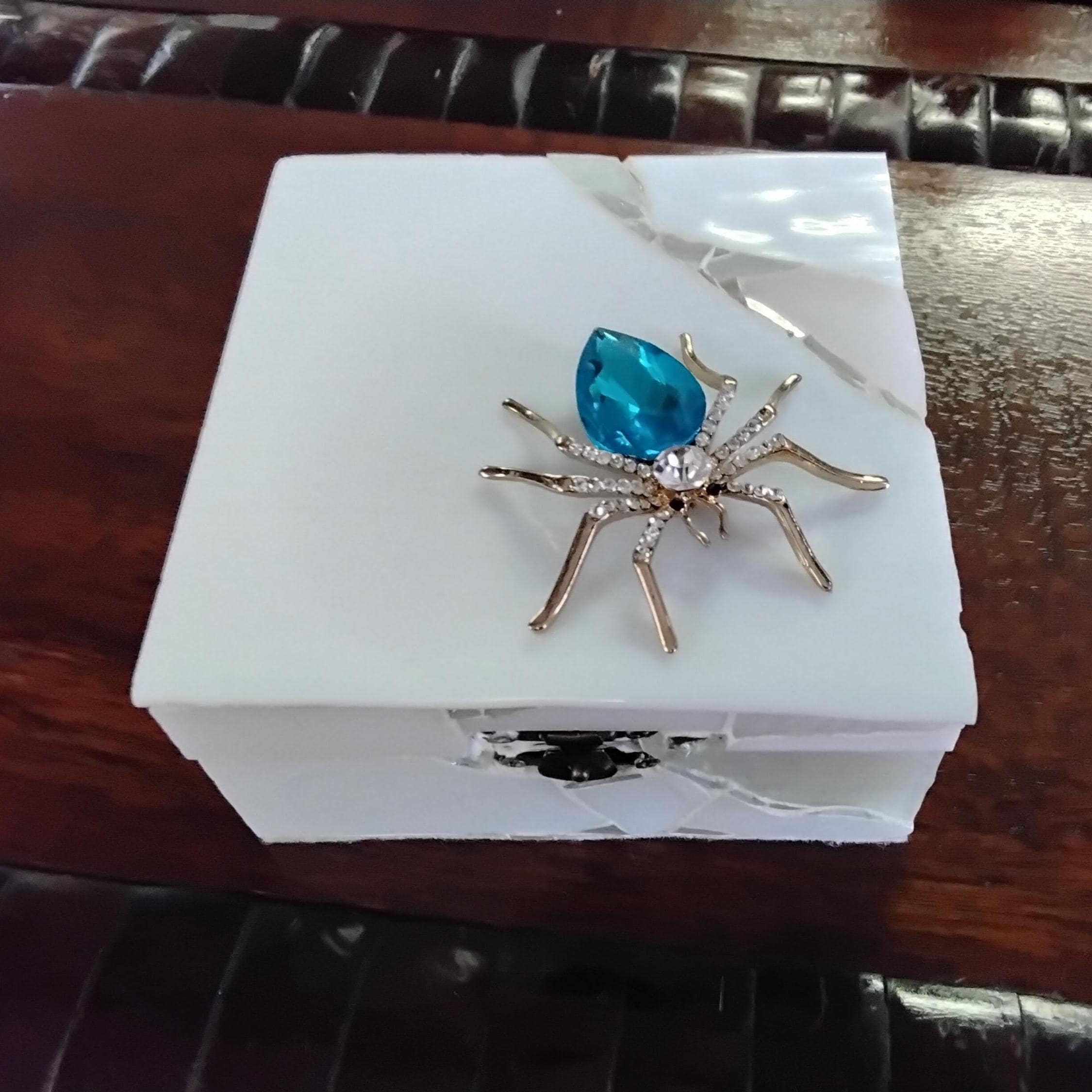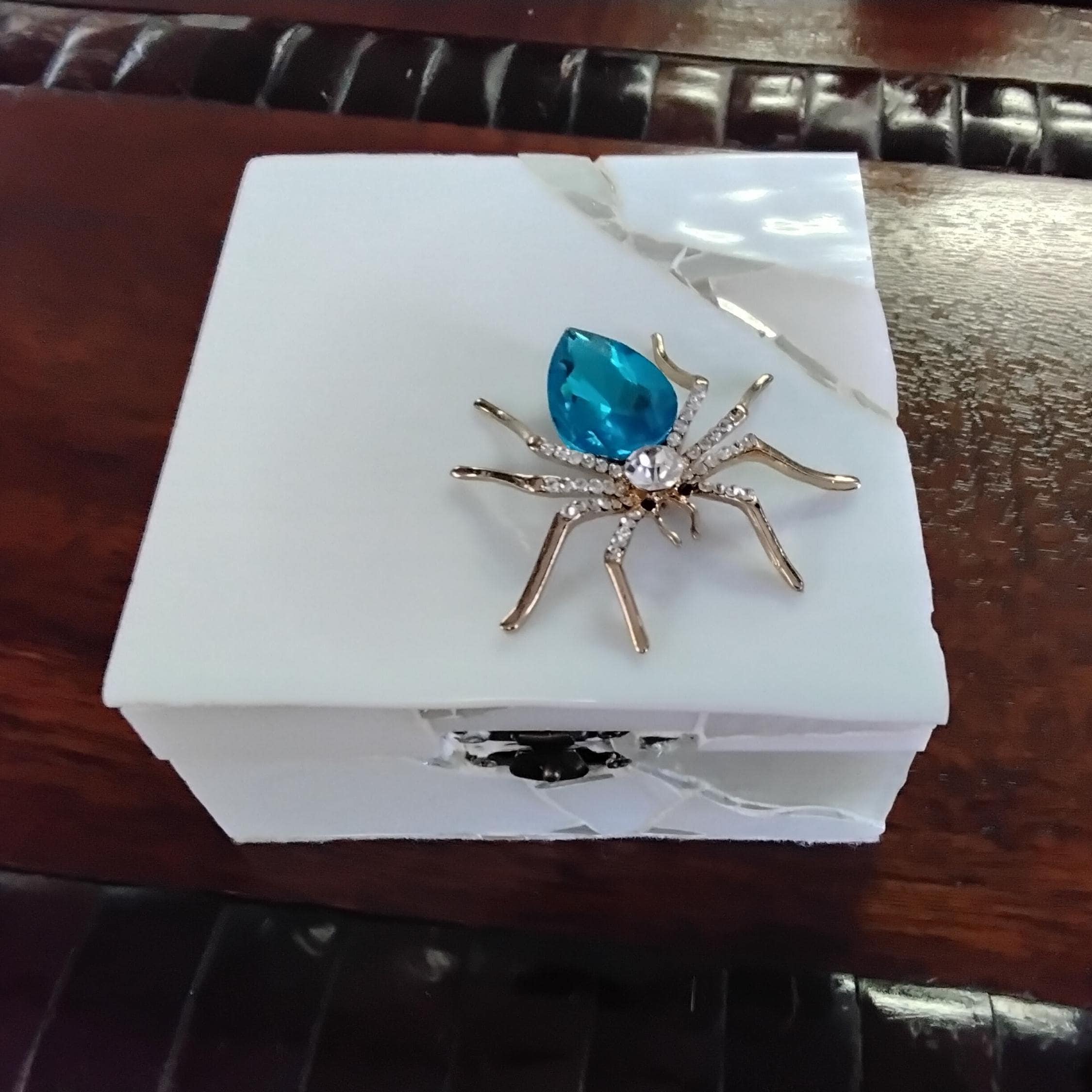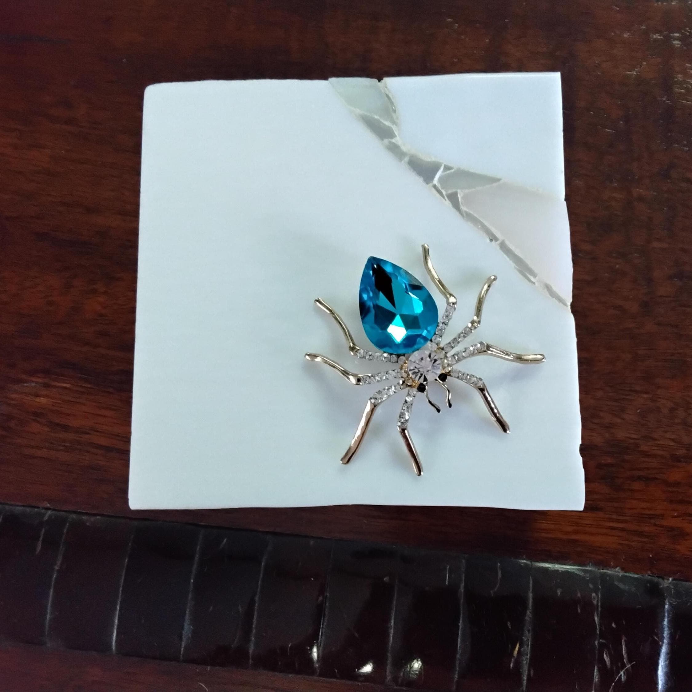 The large spider on top is made of plated silver, rhinestones and a large glass sapphire