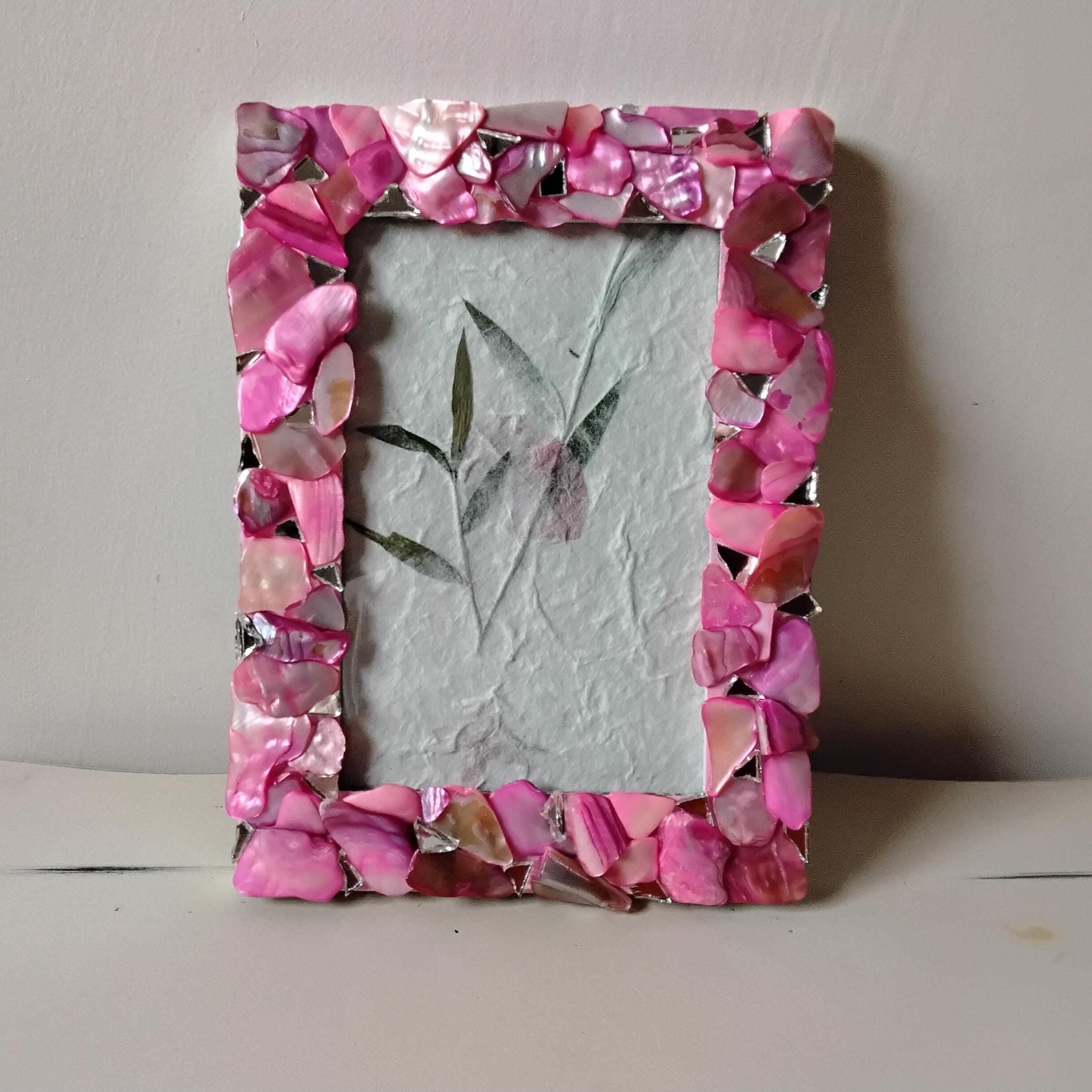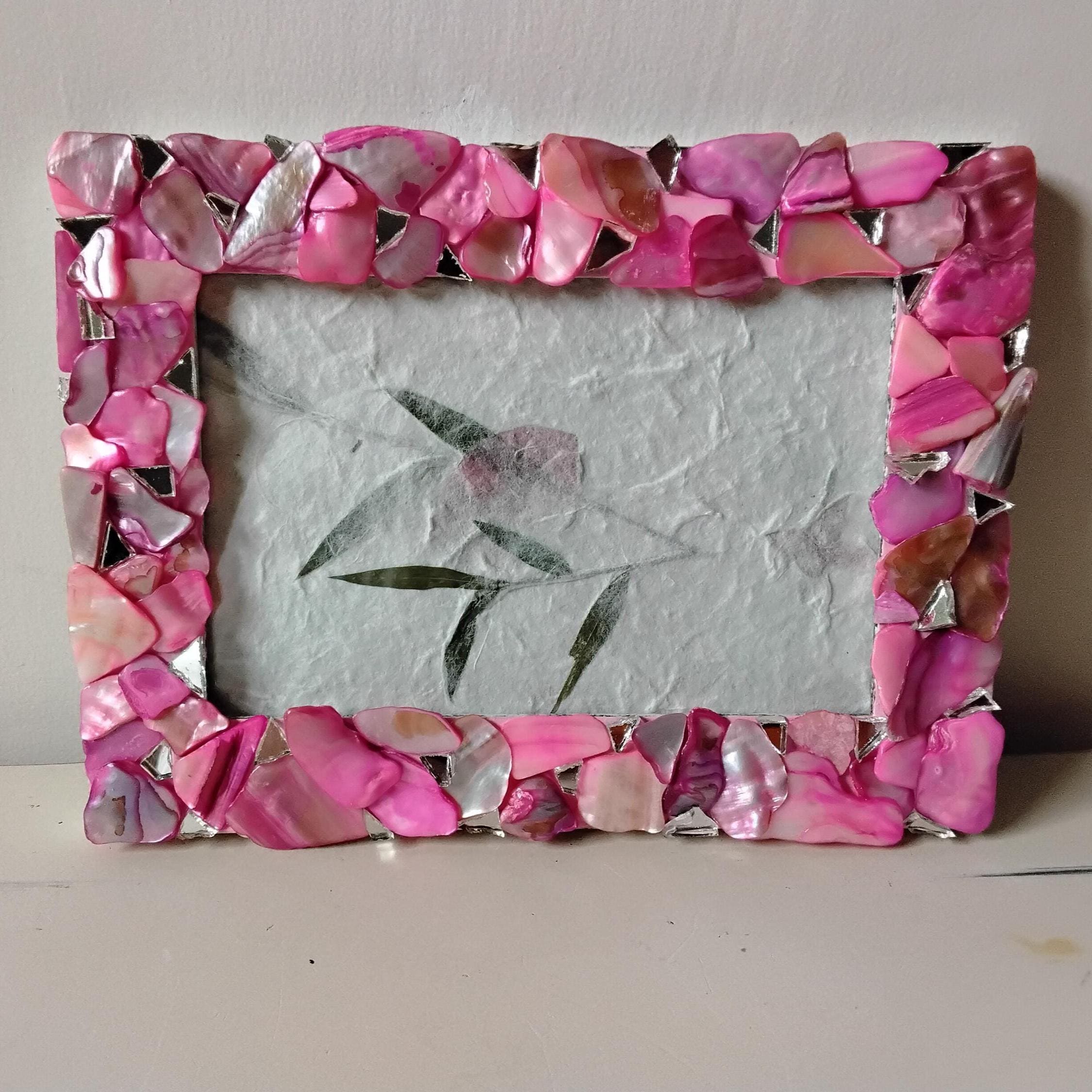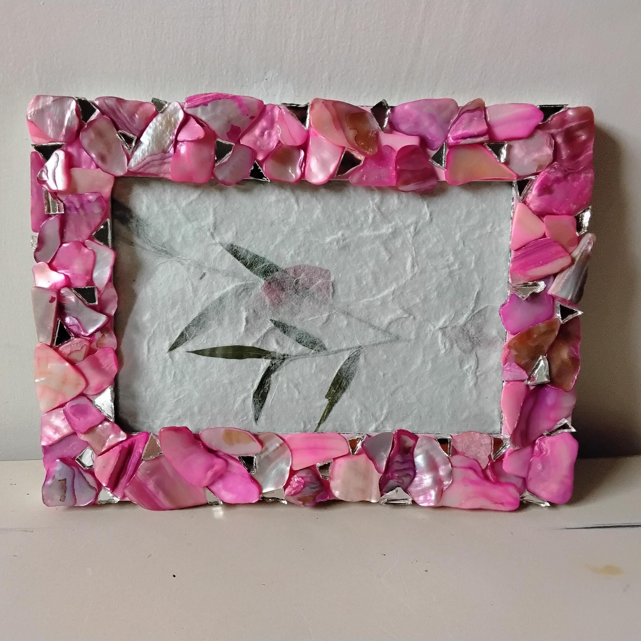 Mosaic Pink abalone Shell and Mirror 4-inch x 6-inch, Vertical or Horizontal, Hanging or Standing Frame with Glass