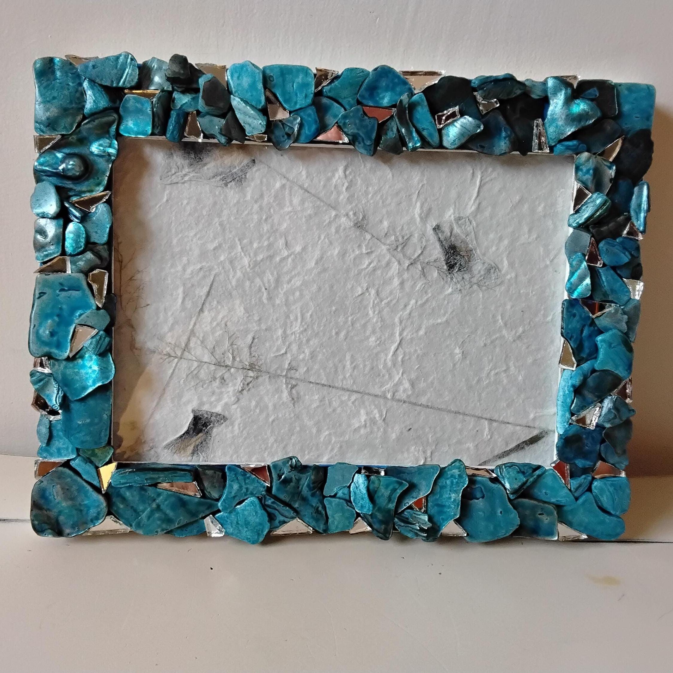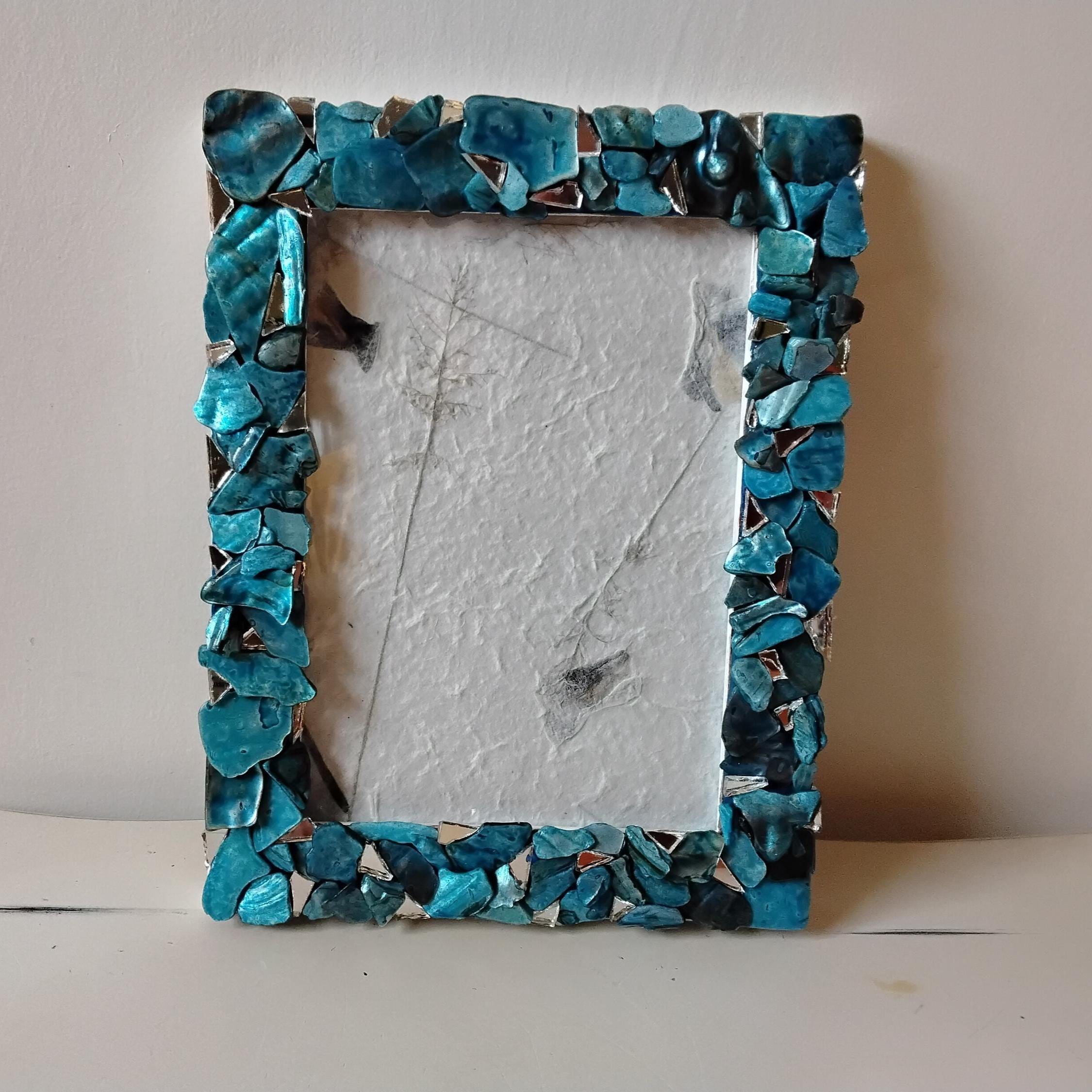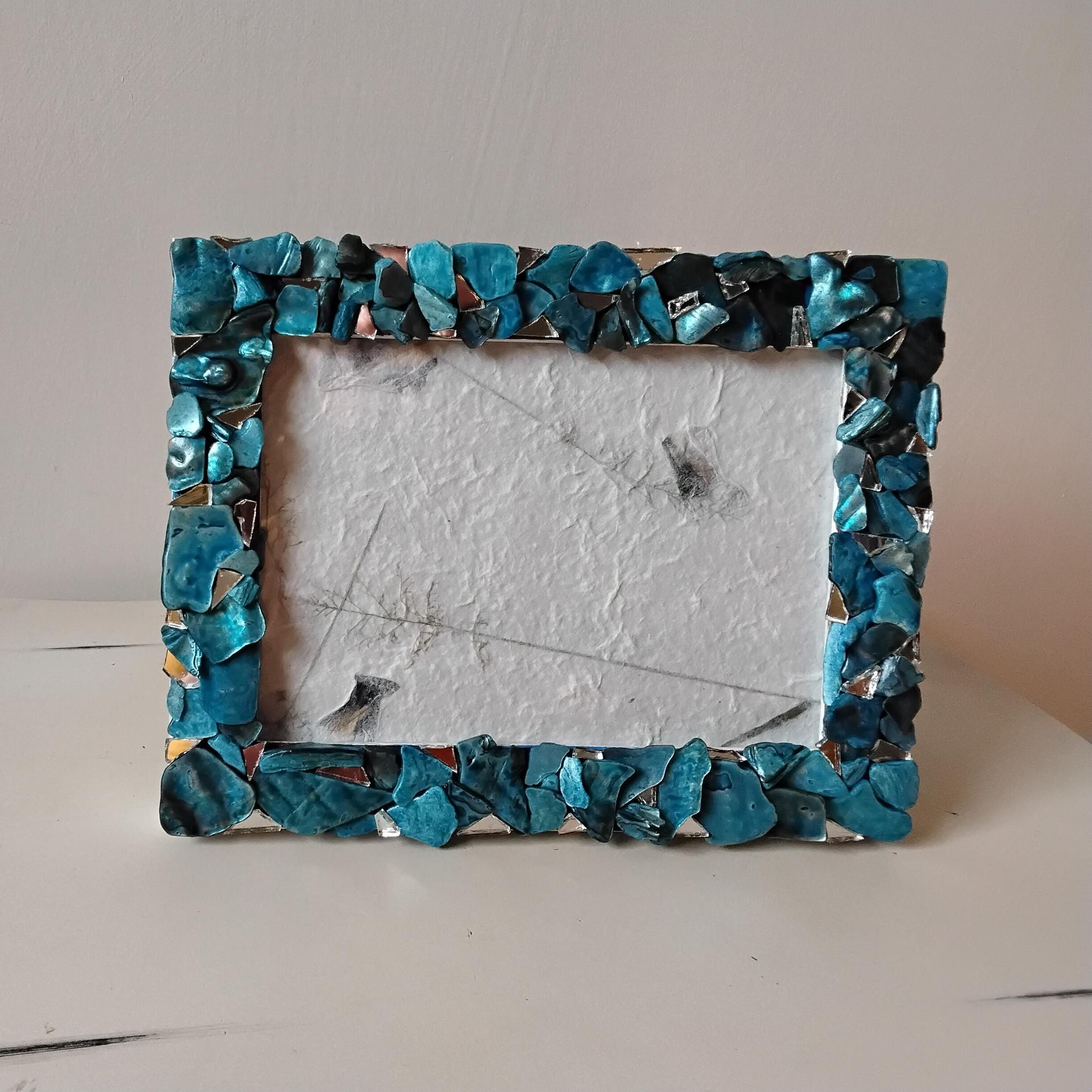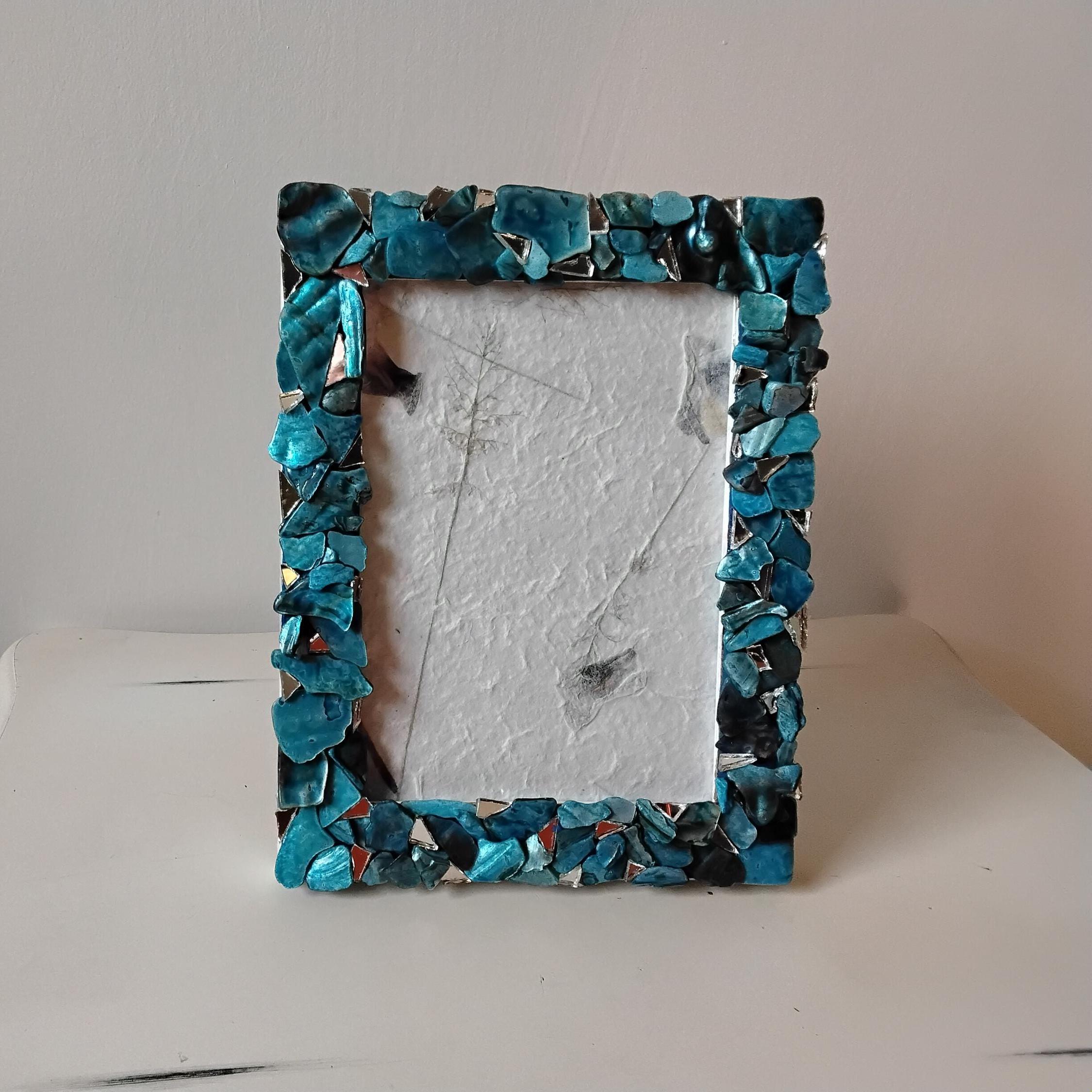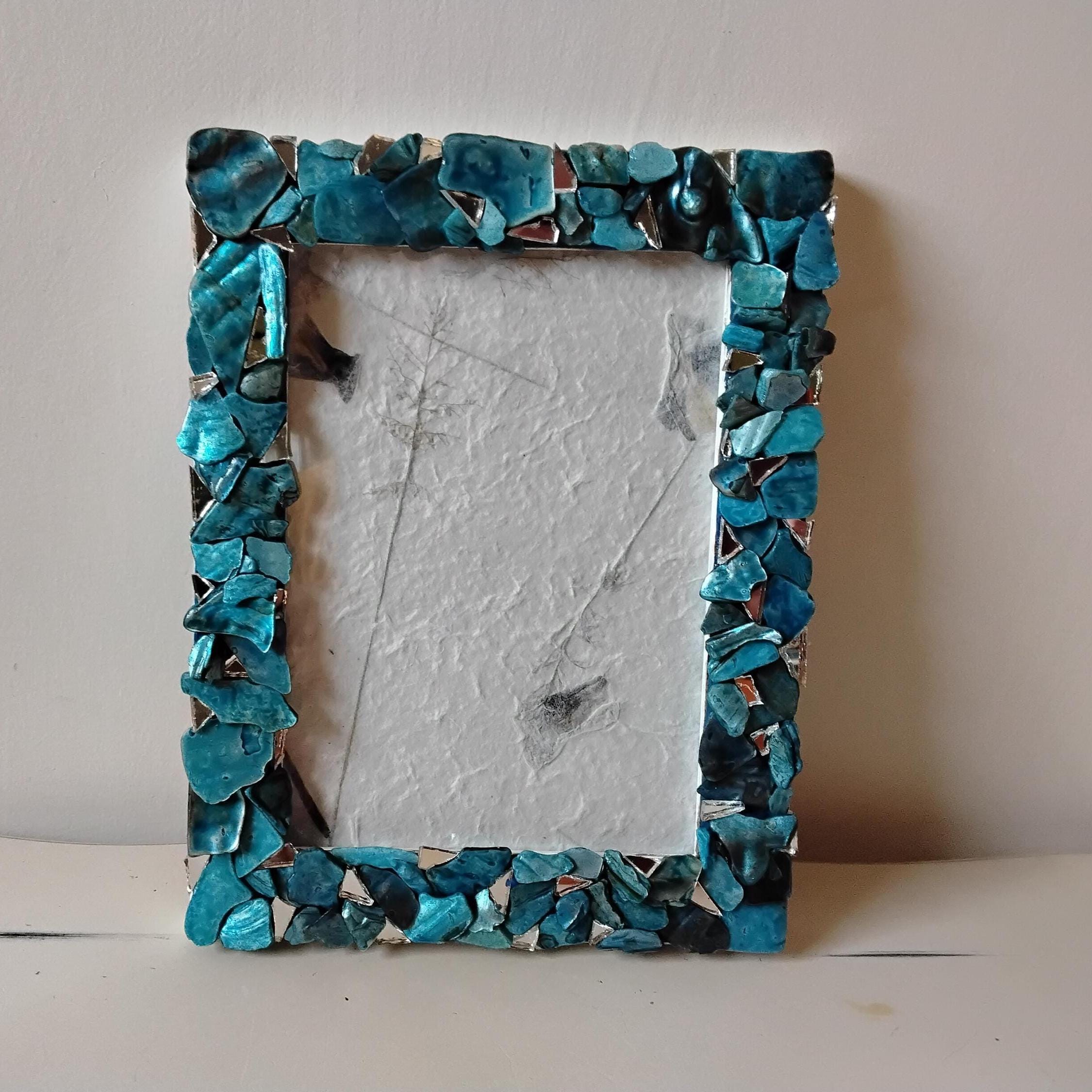 5 x 7-inch Mosaic Ocean Blue Stained Abalone Shell and Mirror Vertical or Horizontal, Hanging or Tabletop, Frame with Glass