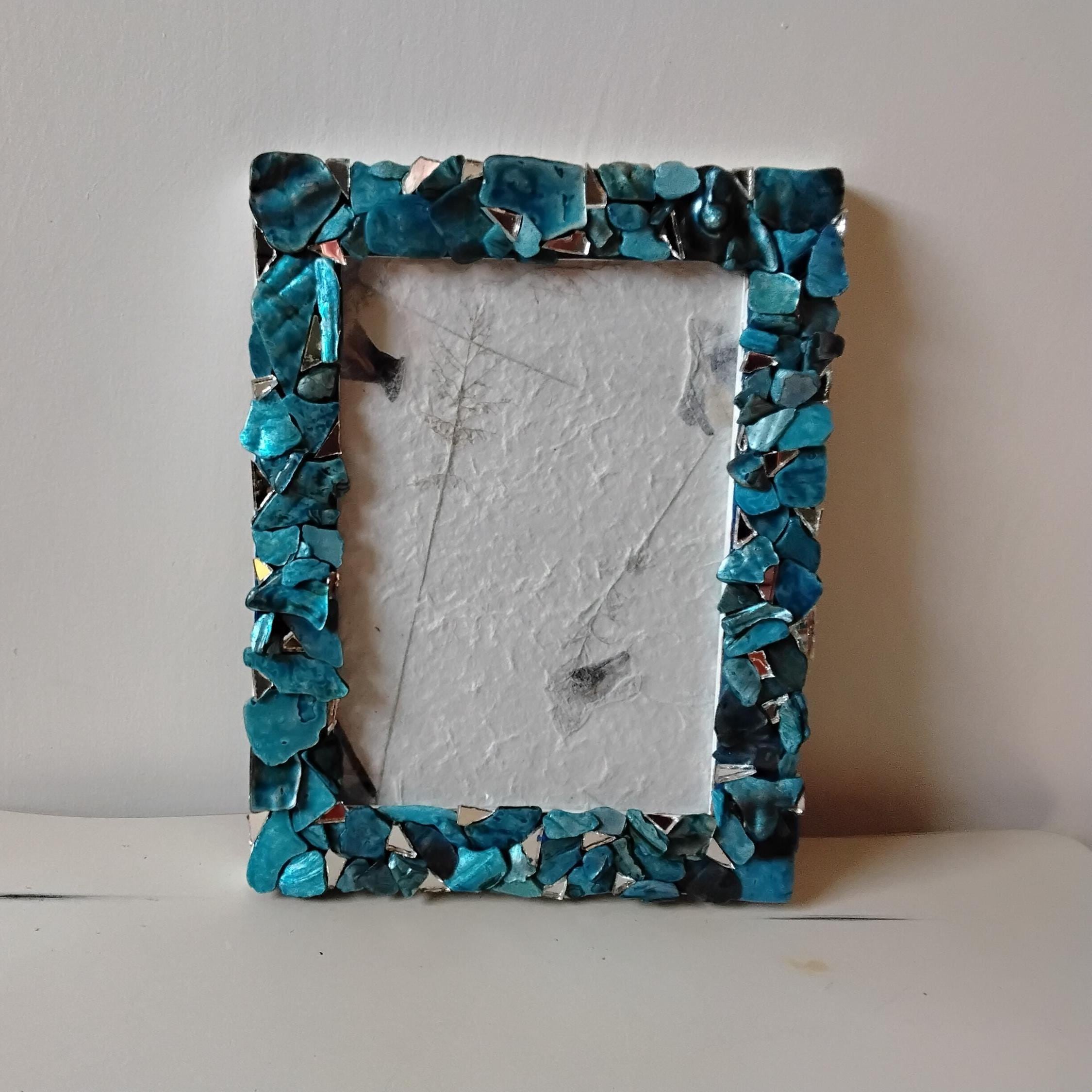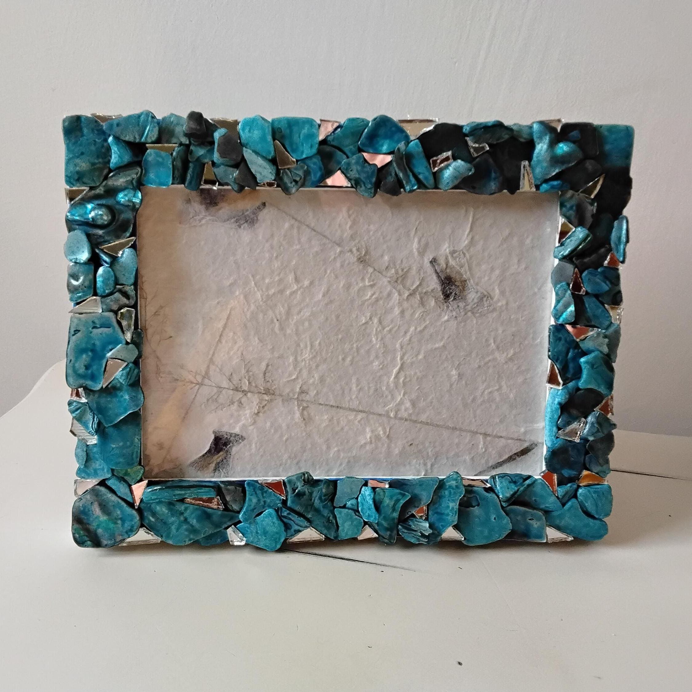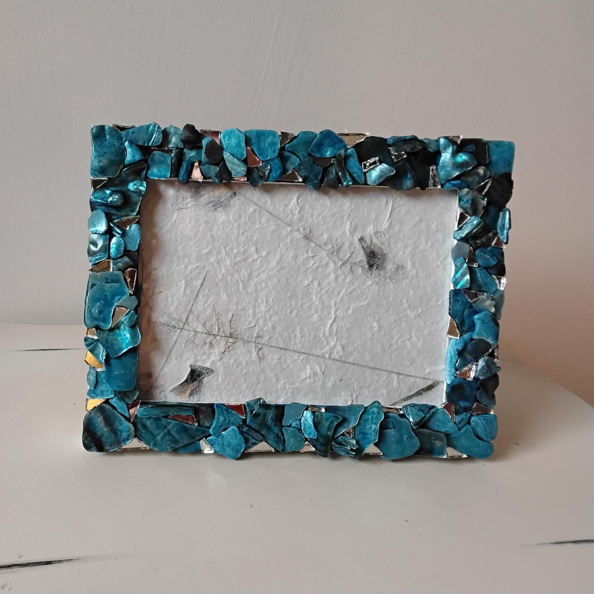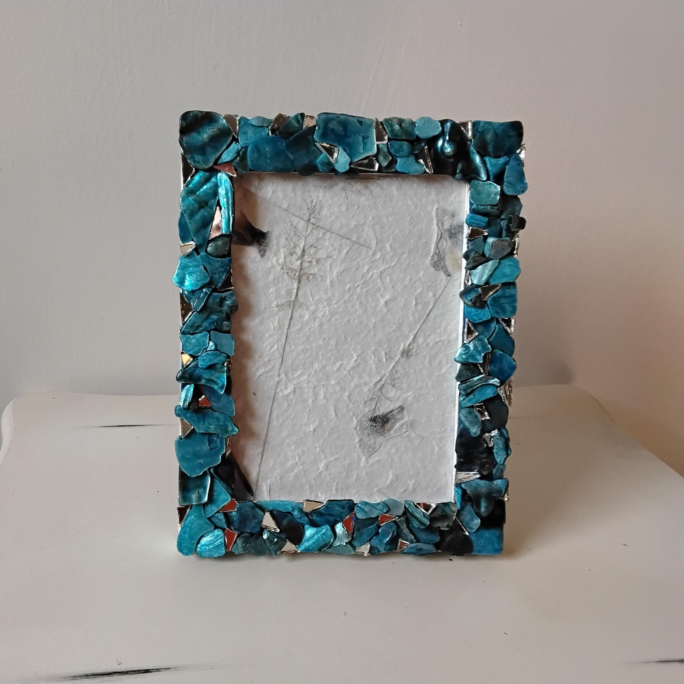 5 x 7-inch Mosaic Ocean Blue Stained Abalone Shell and Mirror Vertical or Horizontal, Hanging or Tabletop, Frame with Glass