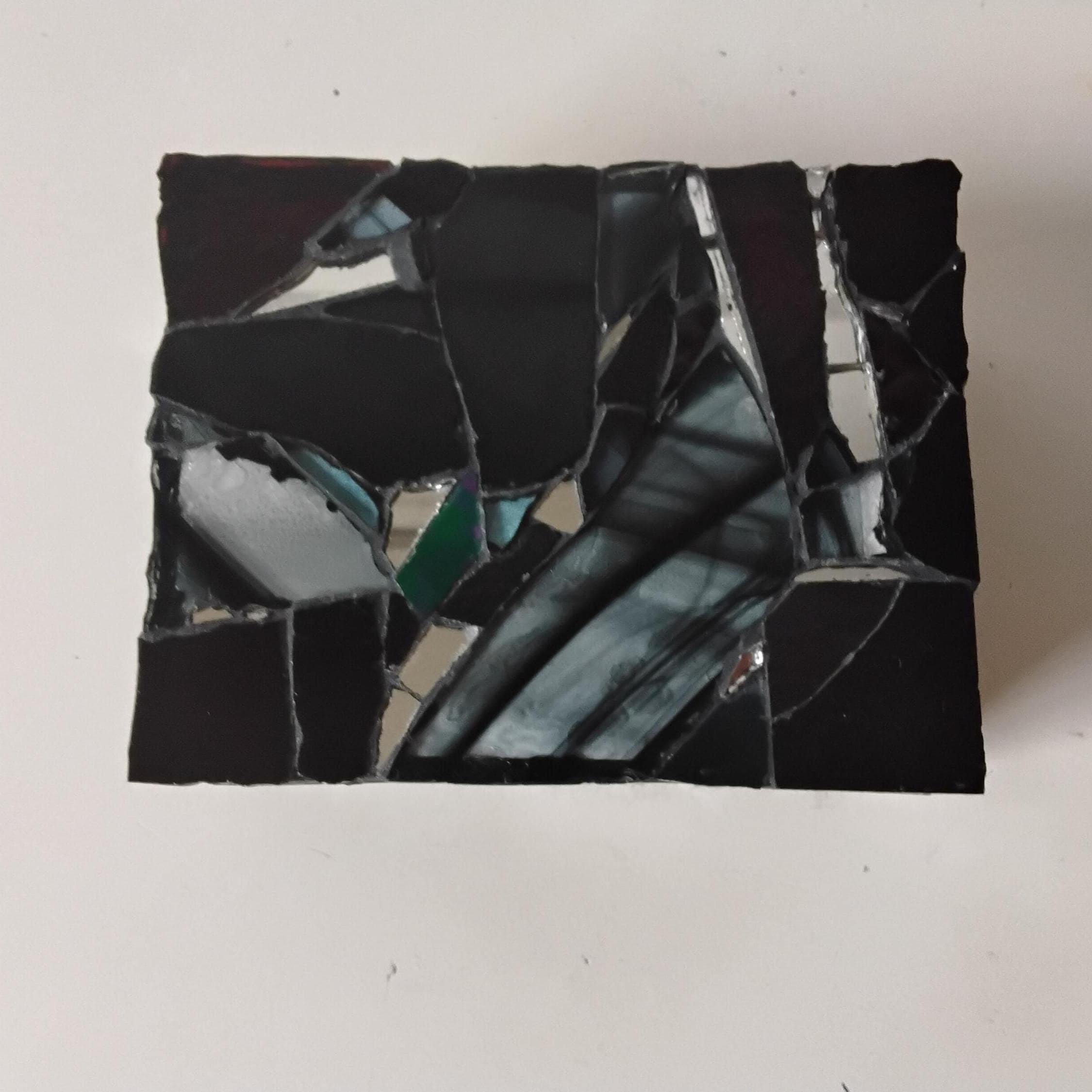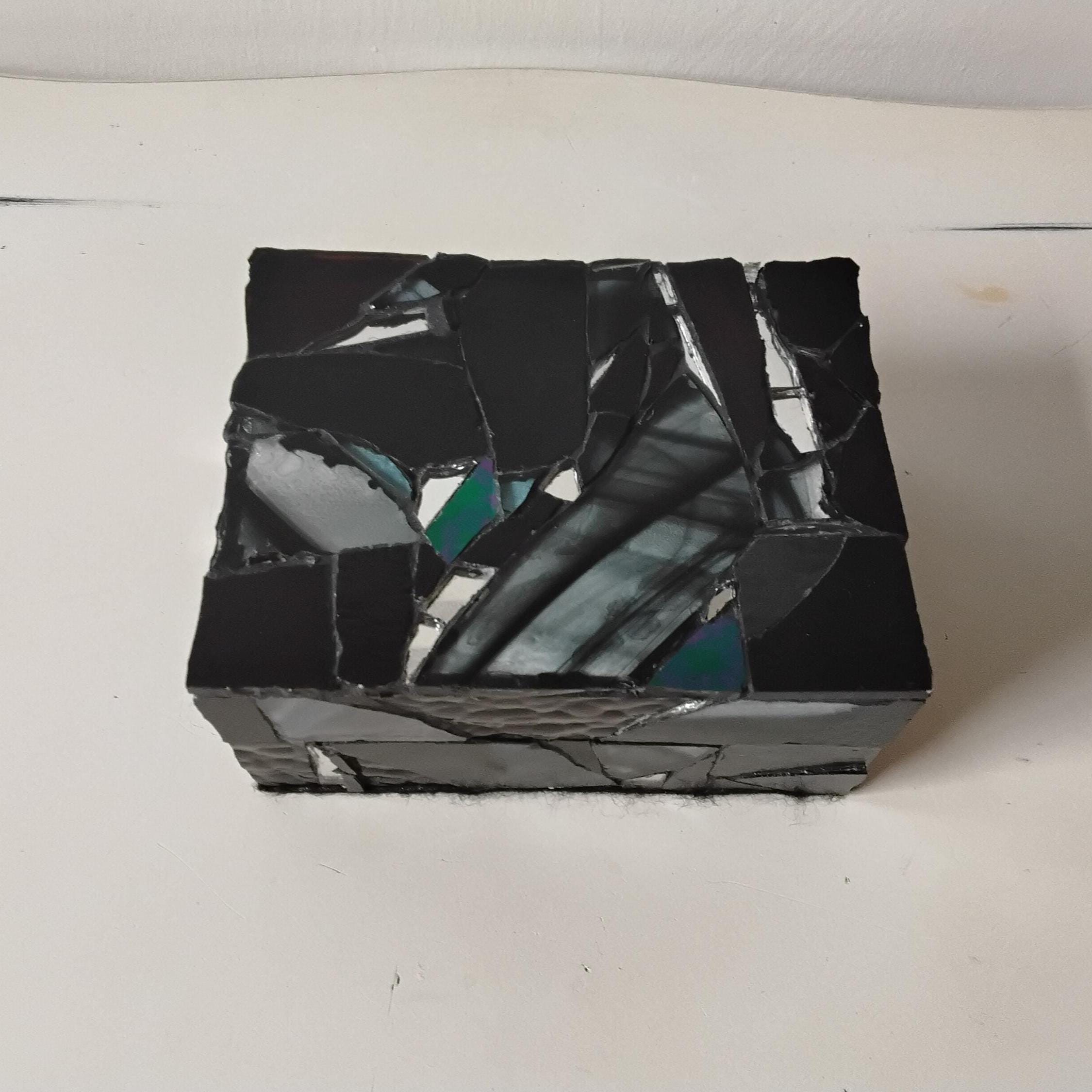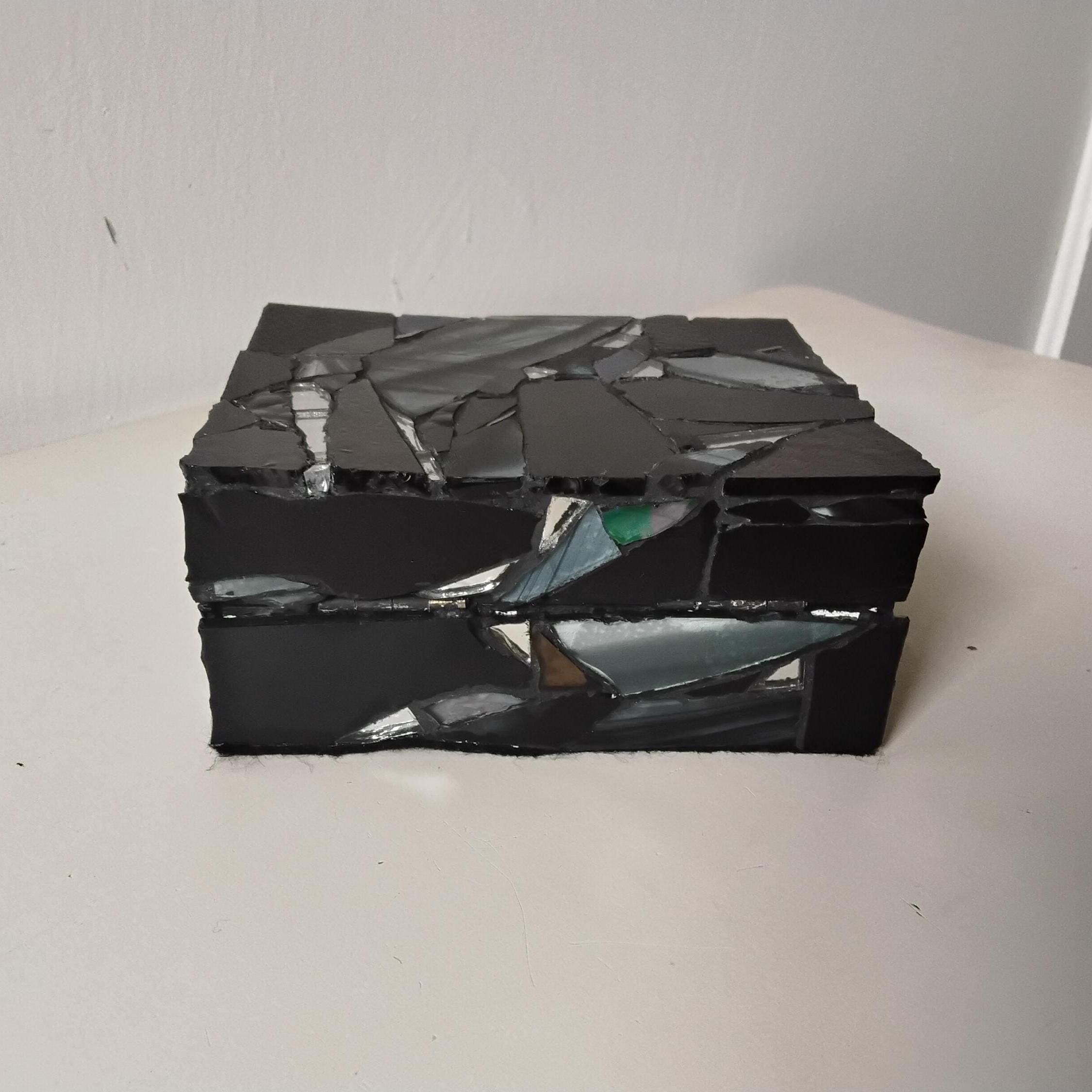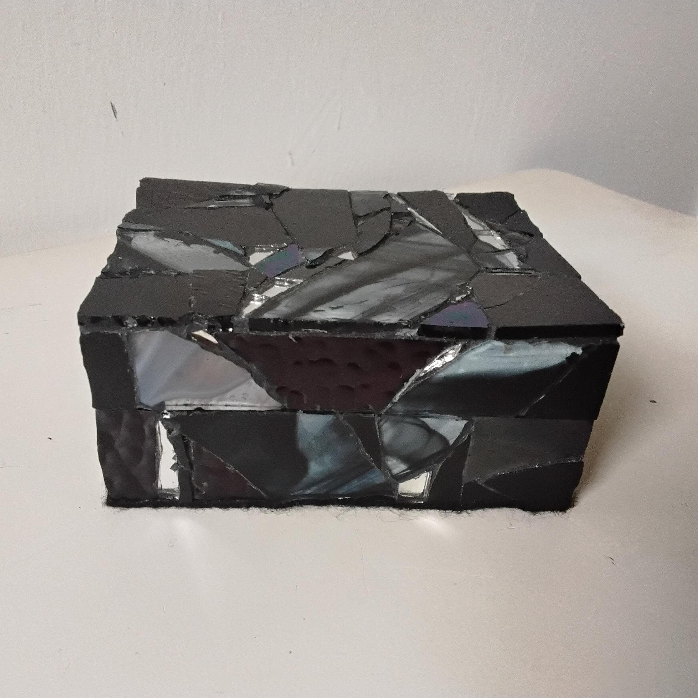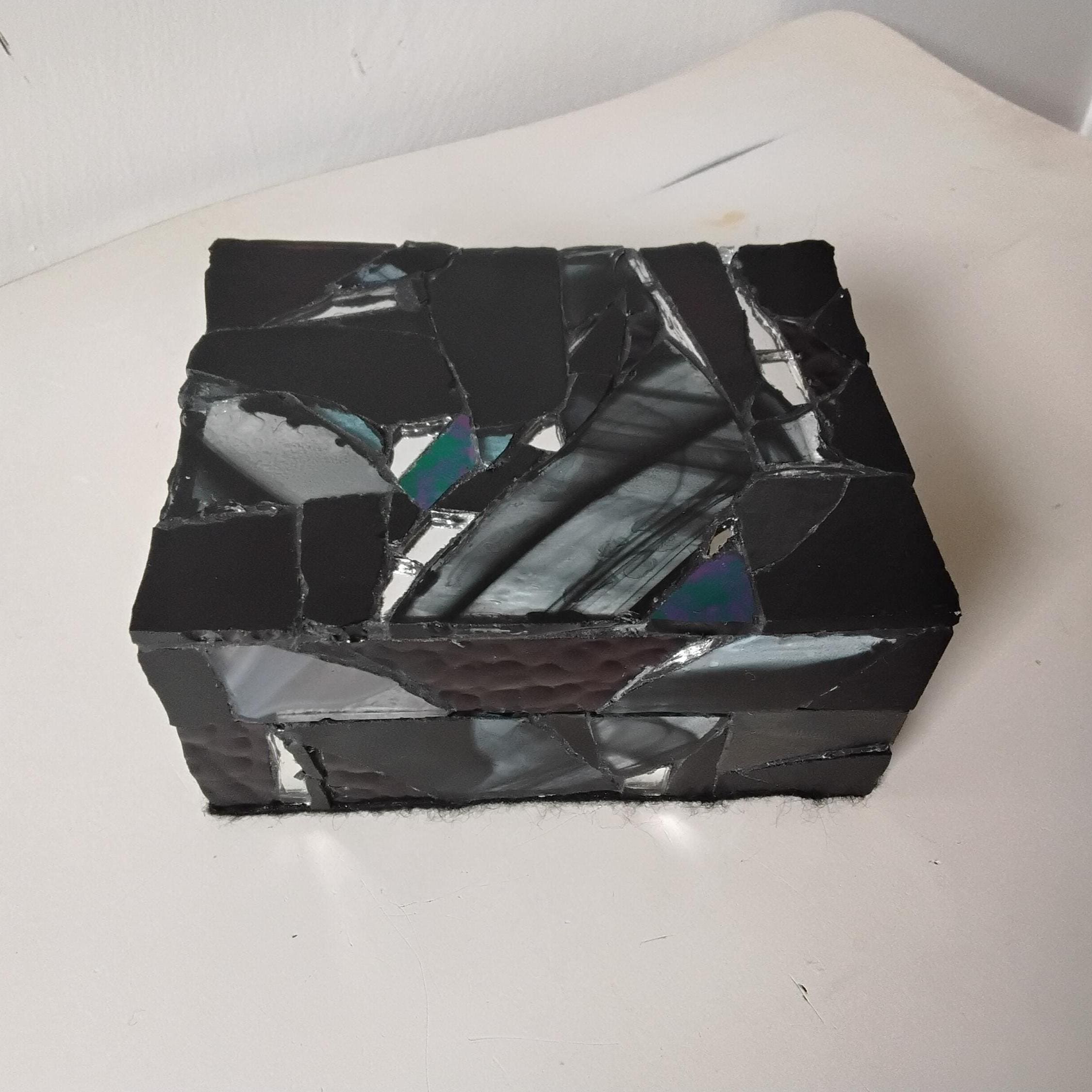 Black Stained Glass and Mirror Mosaic Jewelry, Trinket, Keepsake, Hinged, Ring Box