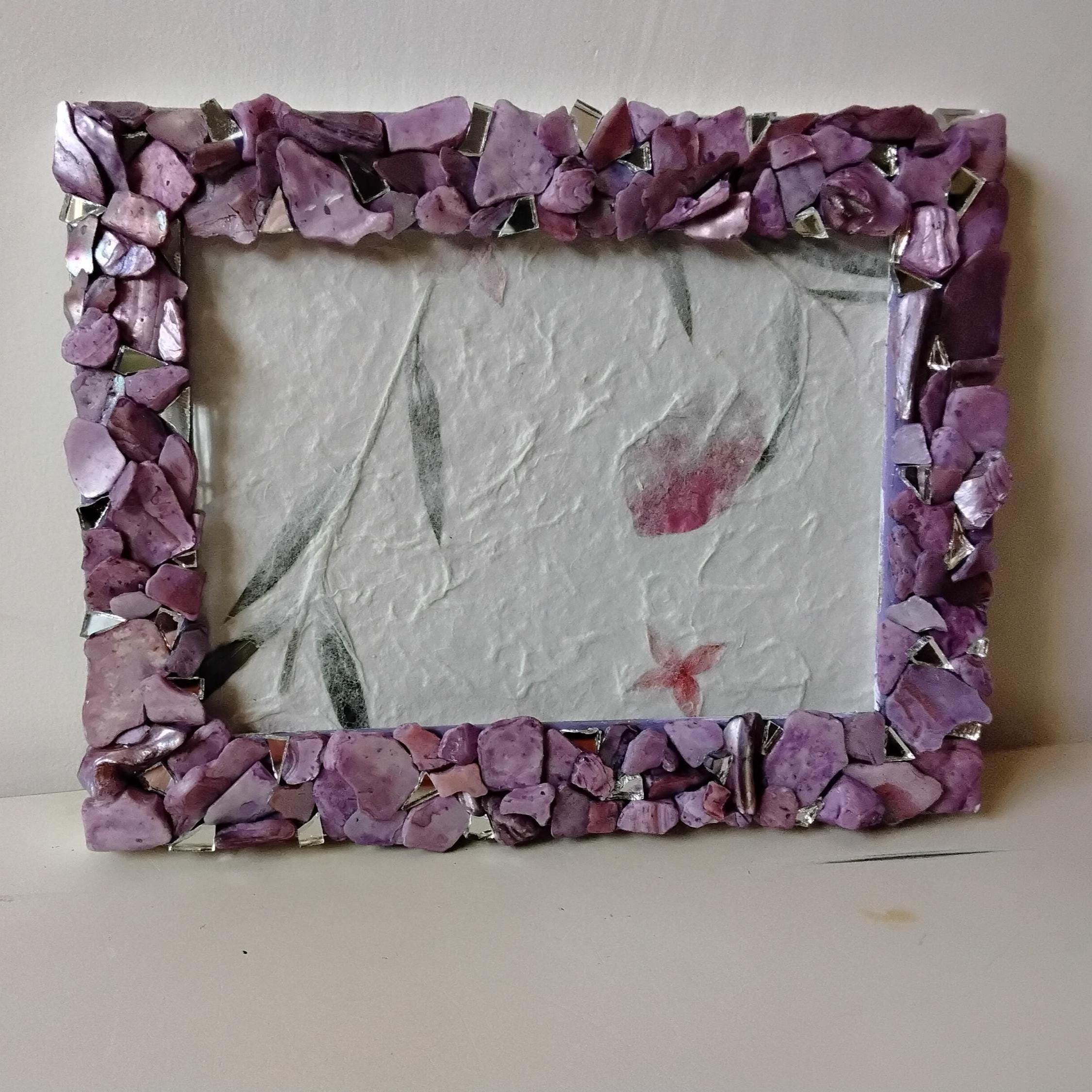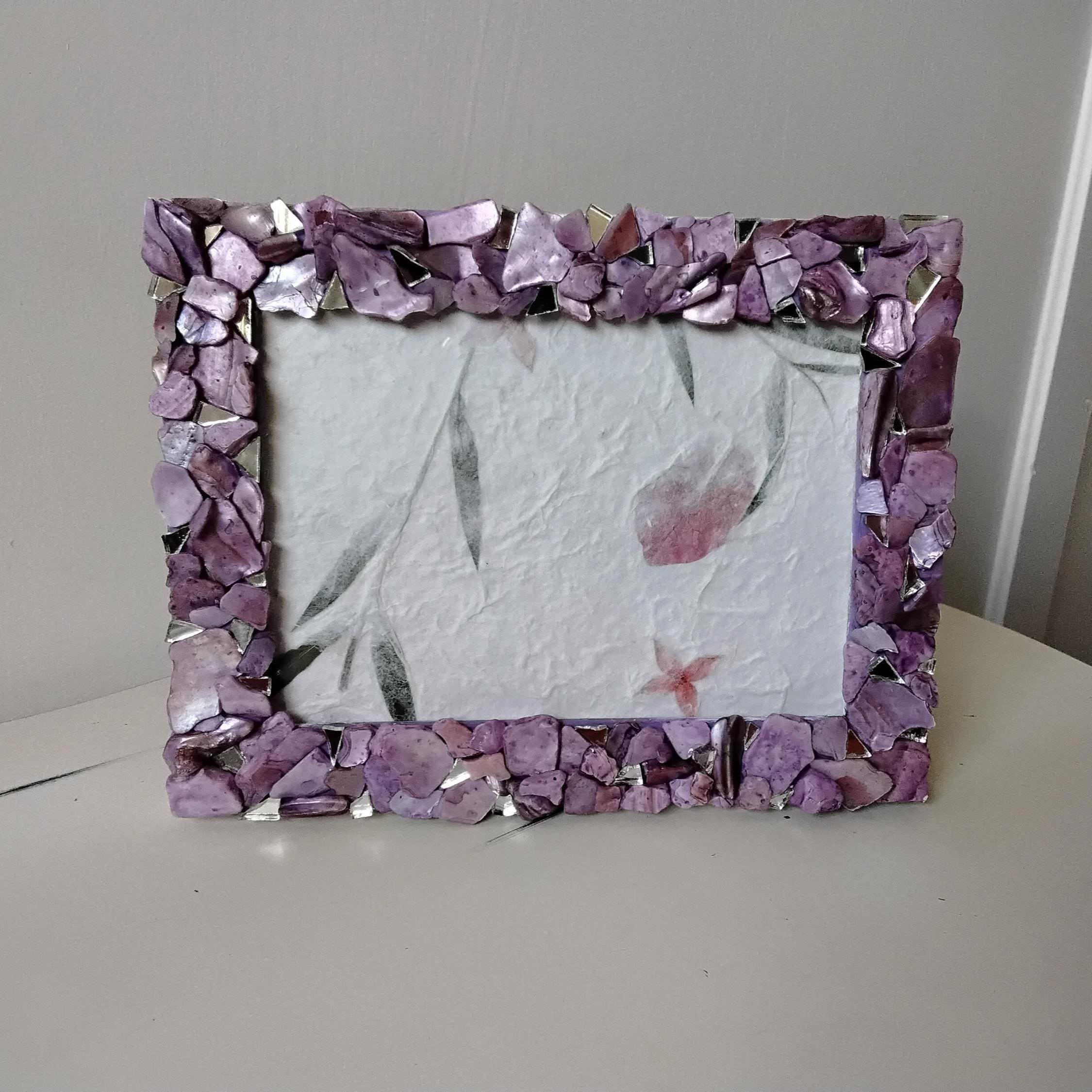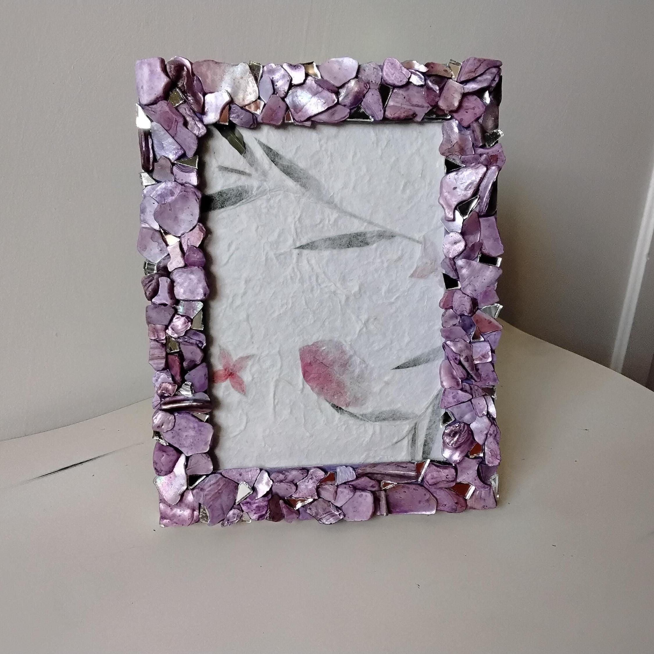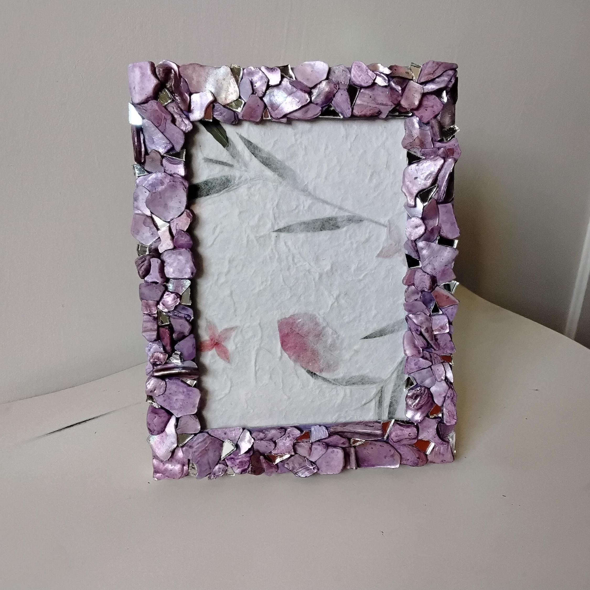 Purple/Lavender-Stained Abalone Shell and Mirror Mosaic, Hanging or Tabletop, Vertical or Horizontal 5 x 7-inch Wood Frame with Glass
