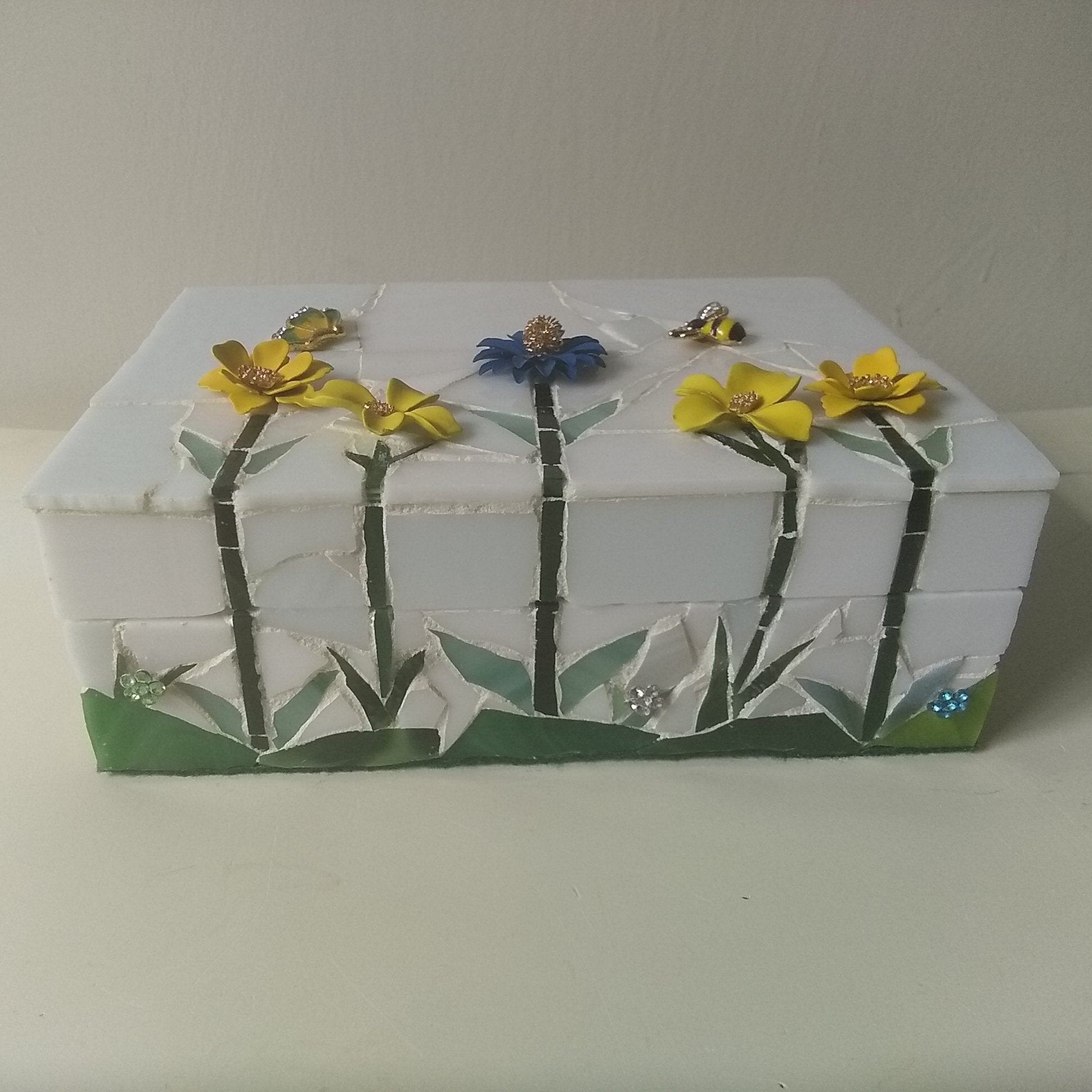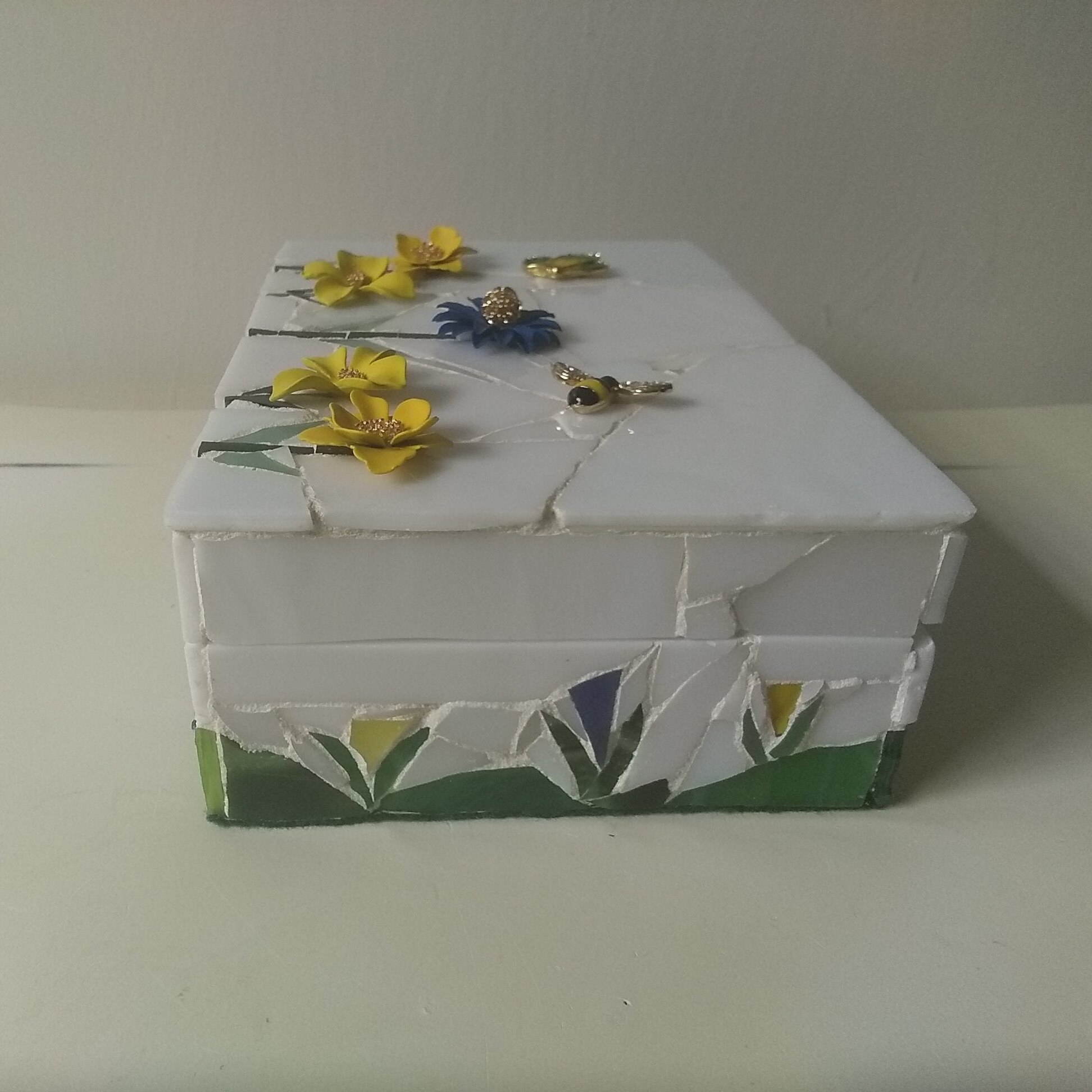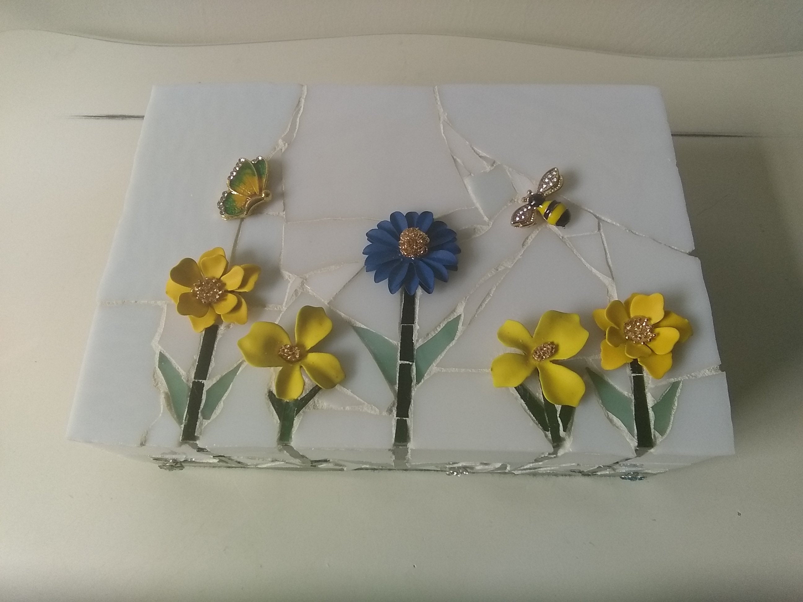 Mosaic Stained Glass Keepsake, Jewelry, Trinket Box With Flowers, Butterfly and Bee