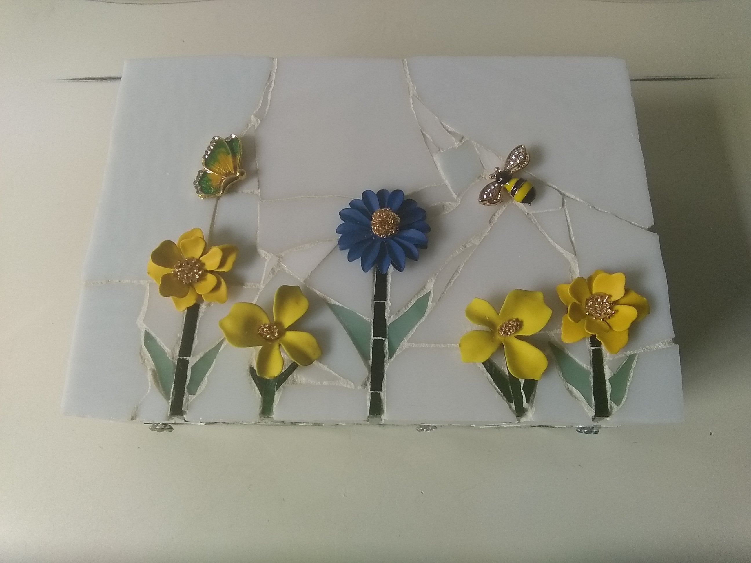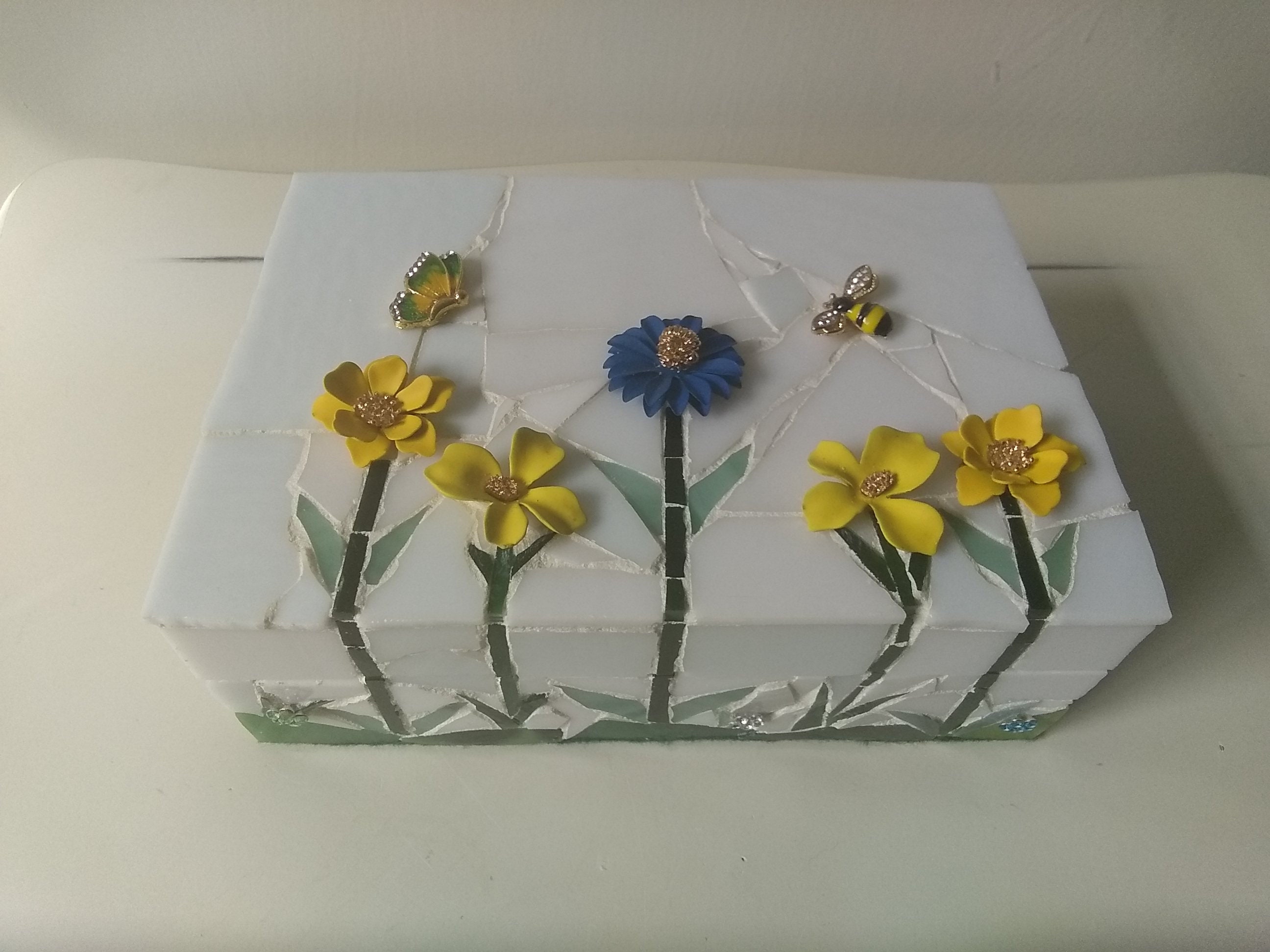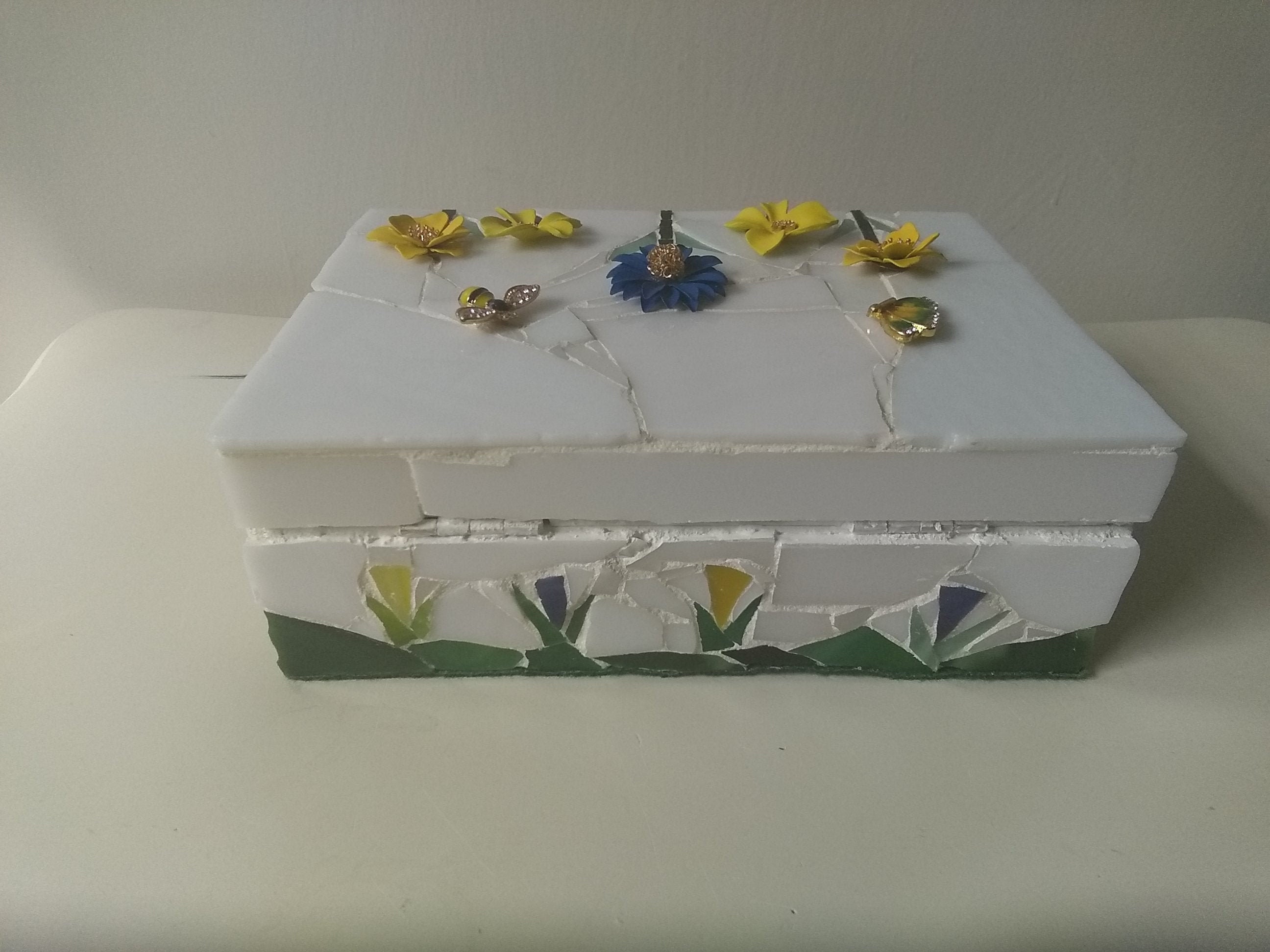 Mosaic Stained Glass Keepsake, Jewelry, Trinket Box With Flowers, Butterfly and Bee